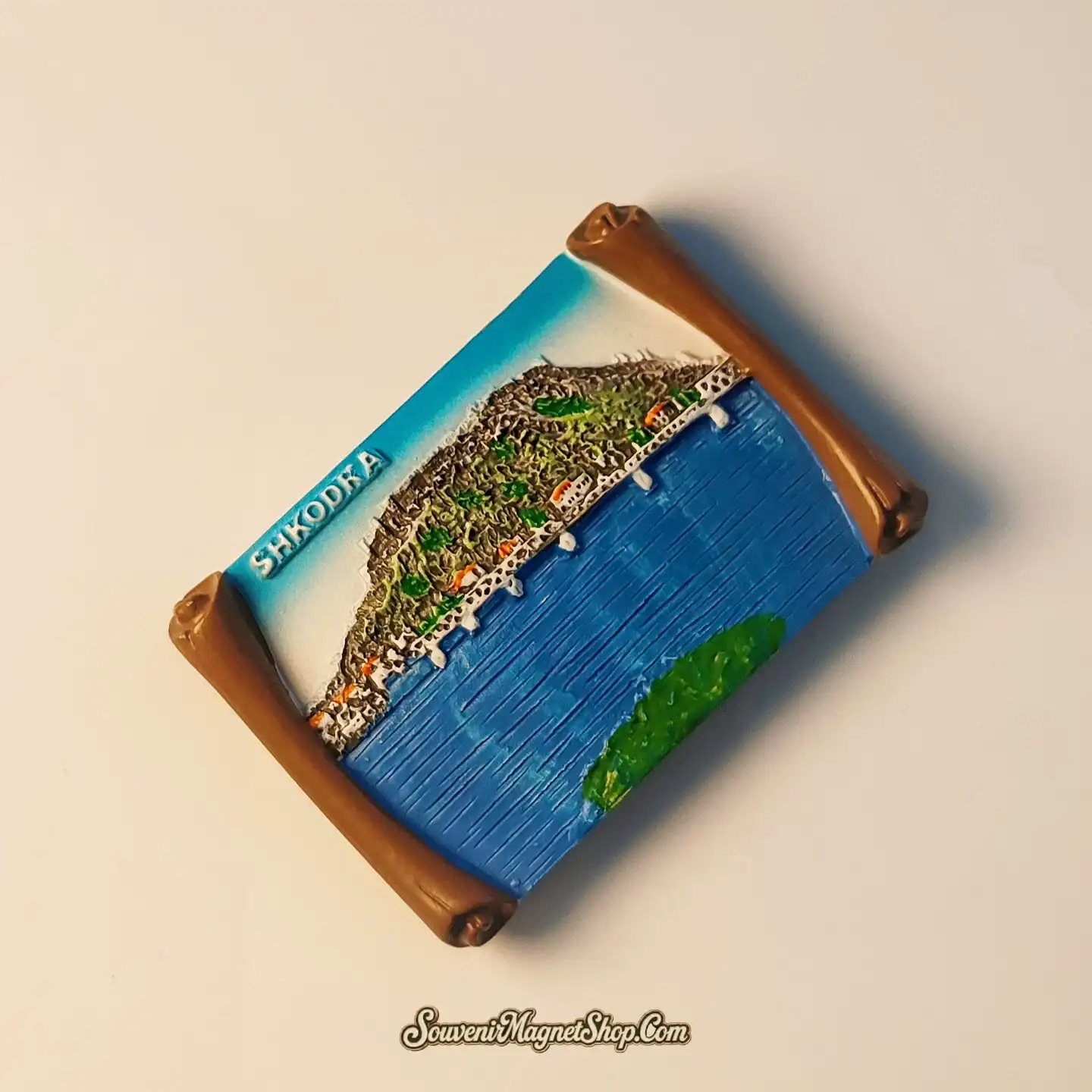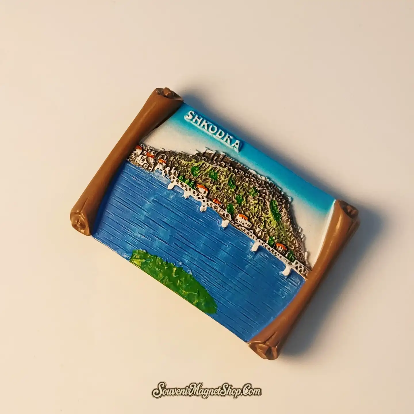 Crafted with intricate detail, the magnet’s unique scroll design elegantly frames the historic panorama, with “SHKODRA” prominently displayed, invoking the ancient manuscripts and chronicles of the region.