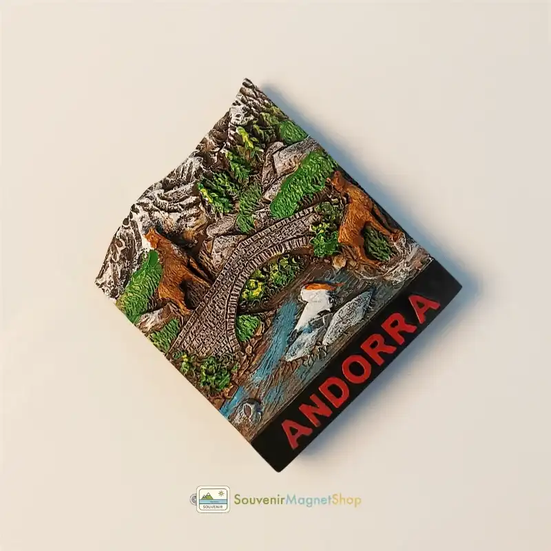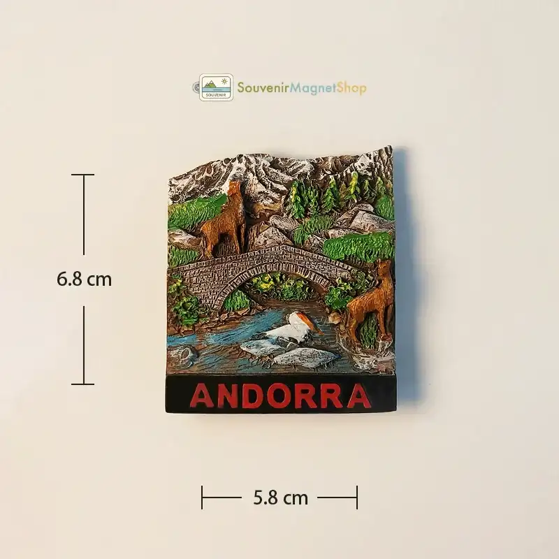 This fridge magnet brings Andorra’s picturesque scenery to life. Expertly crafted from 3D resin, it showcases a hand-painted scene of a rustic stone bridge over a flowing river, with native wildlife looking on from the rocky terrain.