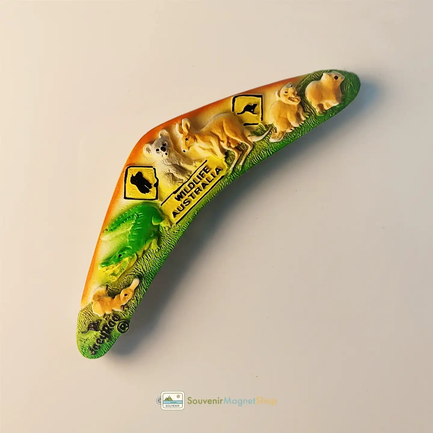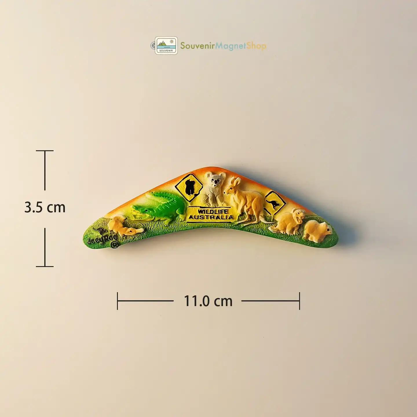 This 3D resin fridge magnet features a creative boomerang design decorated with hand-painted Australian animals such as kangaroos and koalas, blending cultural symbolism with artistic detail to capture the spirit of the Outback.