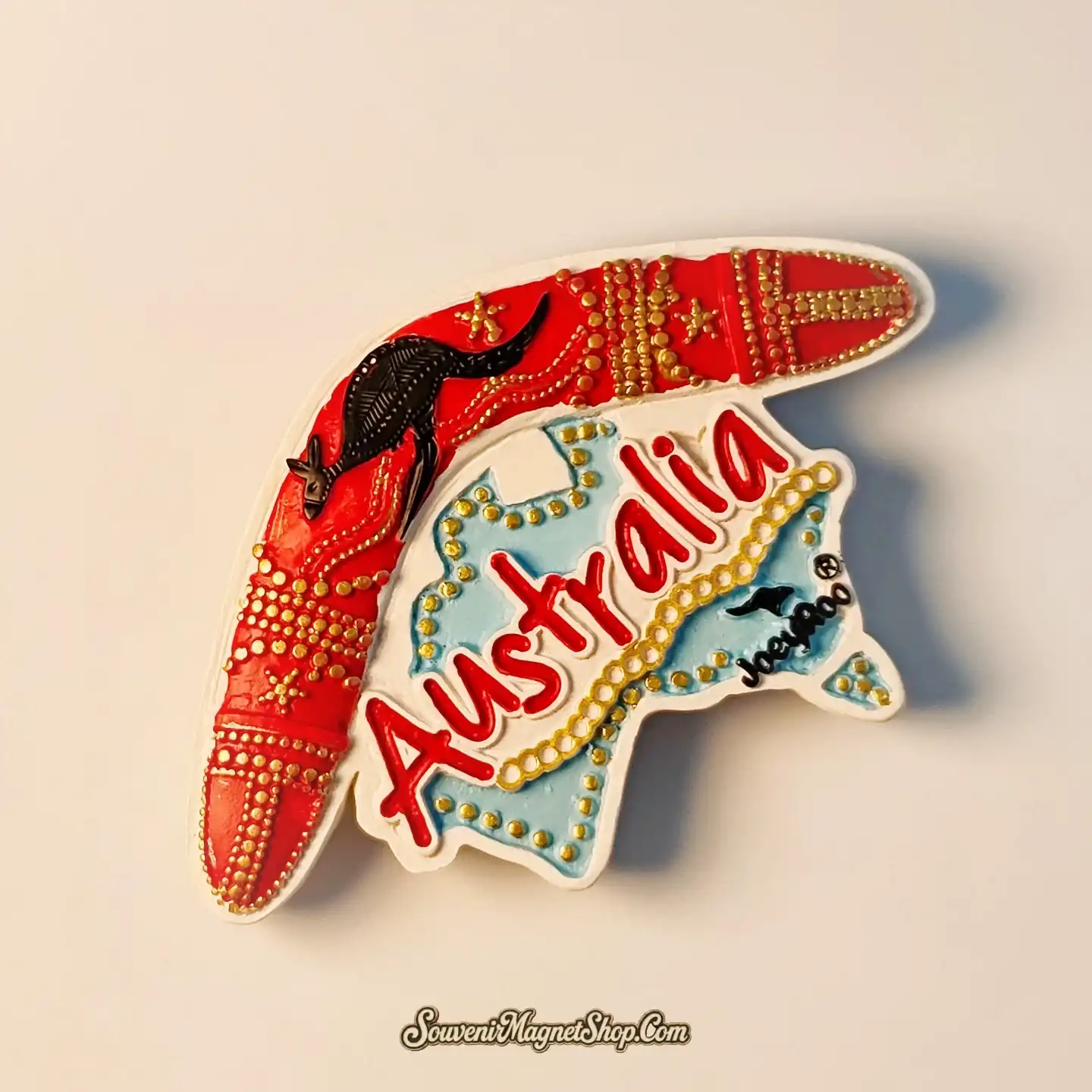 This meticulously crafted 3D souvenir magnet vividly brings Australia’s most beloved symbols to life. Featuring a dynamic kangaroo perched atop a beautifully detailed boomerang, set against the vibrant outline of the Australian map, its hand-painted elements showcase intricate patterns and a rich color palette.