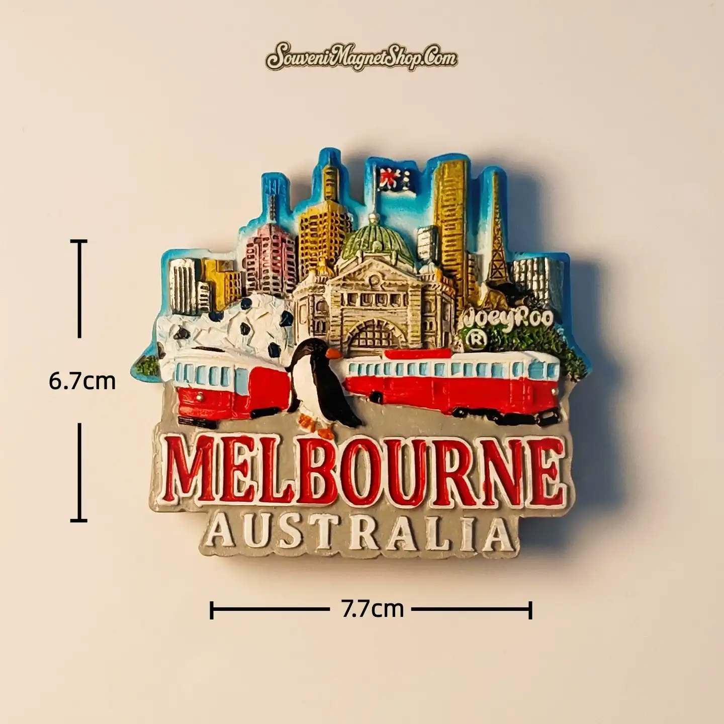 Capture the essence of Melbourne with this intricately hand-painted 3D souvenir fridge magnet. Featuring a picturesque cityscape, the design proudly showcases the historic Flinders Street Station, an instantly recognizable Melbourne tram, and a playful Little Penguin, all set against a vibrant skyline and the Australian flag. Each detail is carefully crafted to bring Melbourne’s unique character to life.