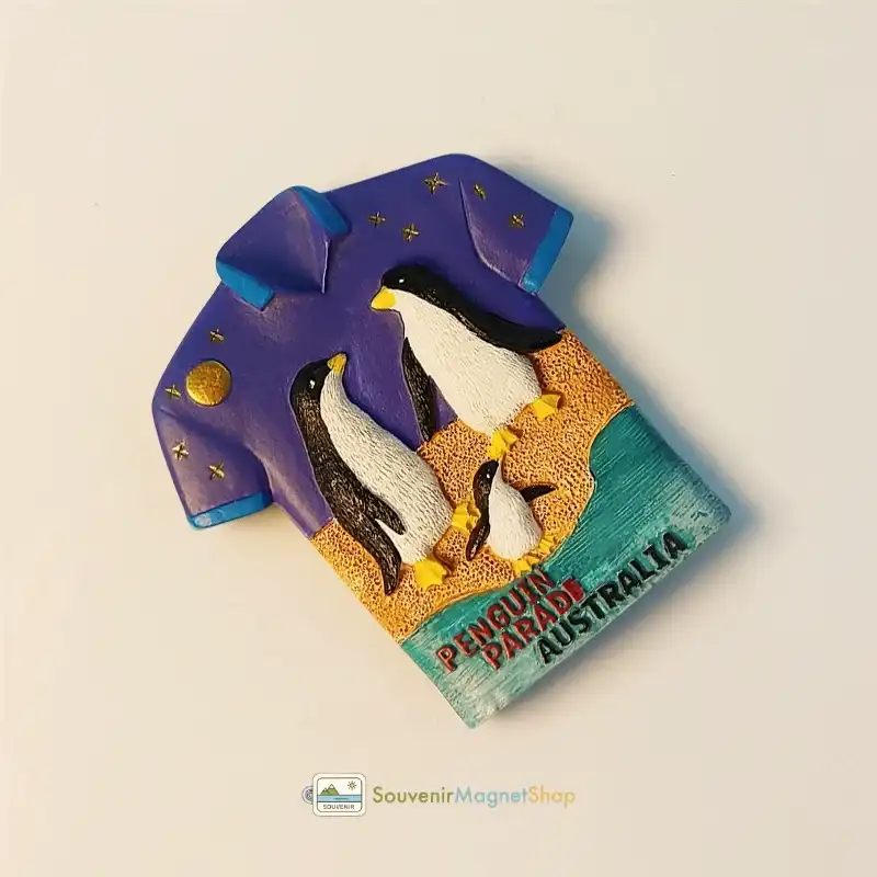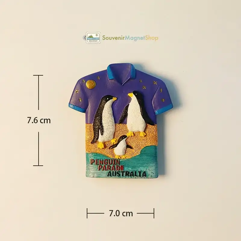 Capture the magic of Australia’s Phillip Island with this hand-painted 3D resin fridge magnet. Features the famous Penguin Parade in a unique T-shirt design.