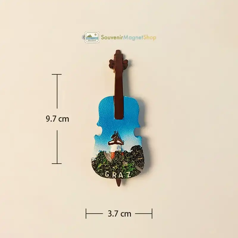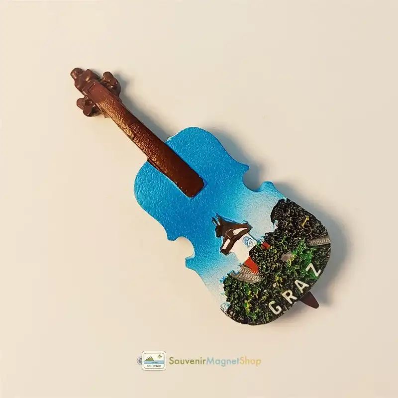 Iconic Graz Clock Tower and lush greenery are beautifully depicted within this unique violin-shaped souvenir magnet, subtly featuring ‘GRAZ’ to capture the city’s charm.