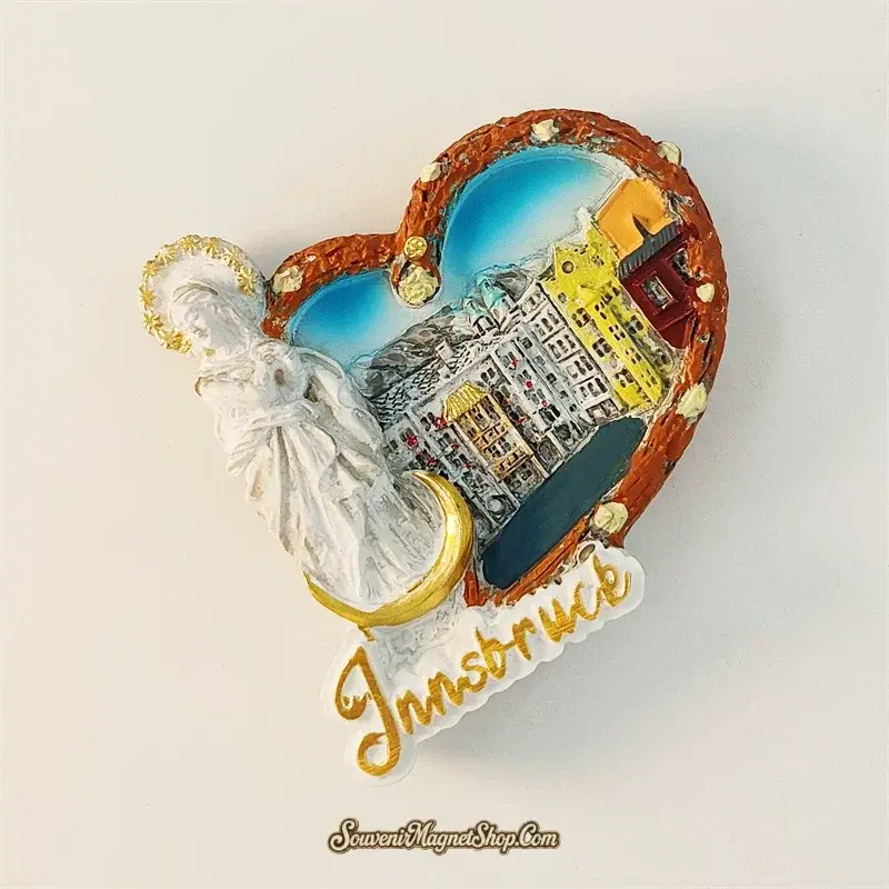 This souvenir fridge magnet captures Innsbruck’s essence in a single, beautifully crafted piece. Shaped as a heart framed by a traditional Austrian pretzel border with hand-painted salt crystals, it holds a miniature panorama of the Old Town’s most recognizable buildings — white, yellow, and red facades standing shoulder to shoulder beneath a bright Alpine sky. On the left, a white Madonna statue with a golden halo stands gracefully atop a crescent moon, echoing the Marian columns and religious sculptures found throughout Tyrol. The gold cursive “Innsbruck” lettering at the base completes the design.