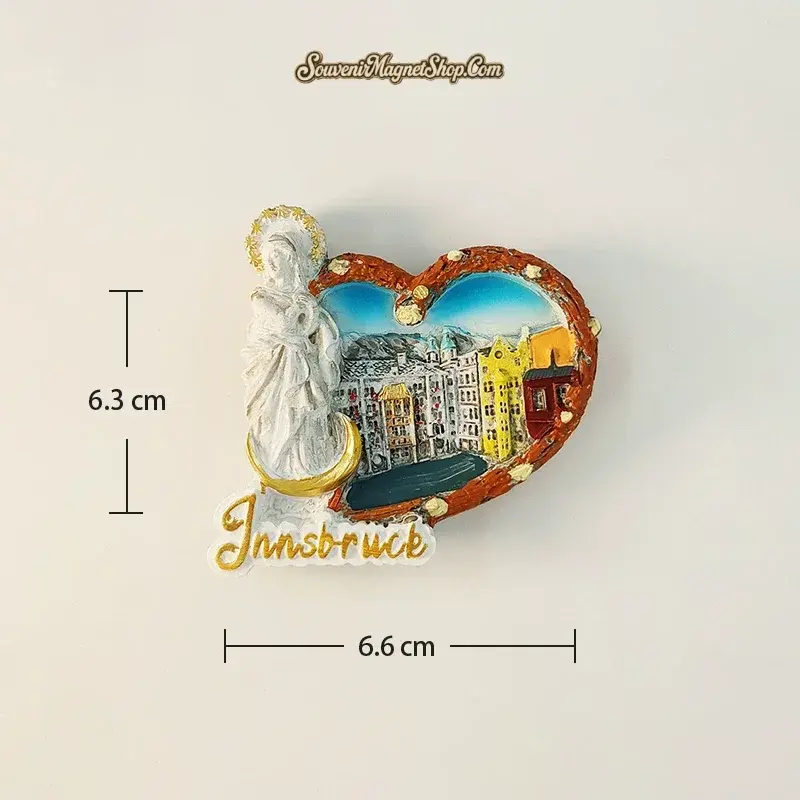Each magnet is crafted in resin with layered relief construction that gives the cityscape genuine depth. The pretzel frame curves around the scene with realistic texture and golden-brown baking tones, while the Madonna figure protrudes with fine sculptural detail. The Alpine buildings inside the heart window are hand-painted with vivid color and architectural accuracy, capturing the warm, inviting feel of an Innsbruck afternoon.