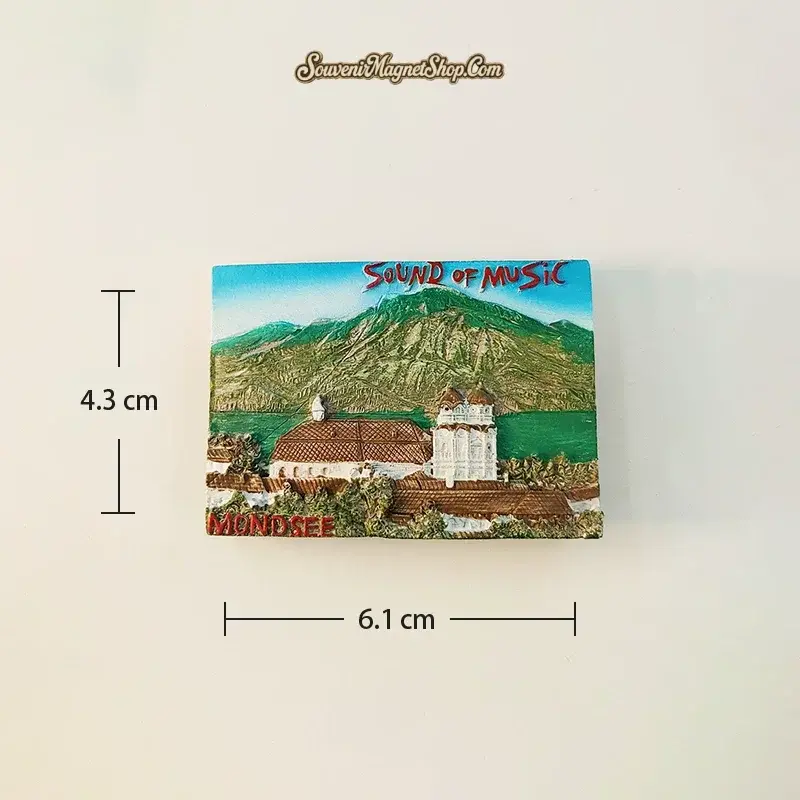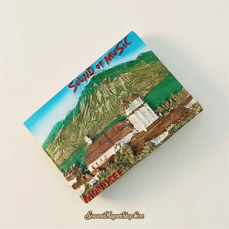 This 3D resin fridge magnet captures the heart of Mondsee in miniature — the white baroque facade of St. Michael’s Basilica sits at the center, its brown-tiled roof and bell tower rendered in careful detail. Behind it, a green alpine mountain rises against a bright blue sky, with the calm waters of Mondsee Lake visible between the church and the hillside. The words “SOUND OF MUSIC” arc across the top in red, while “MONDSEE” is painted along the base.