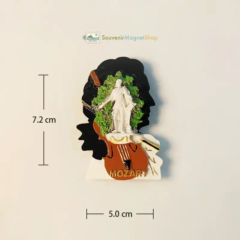 Capturing Austria’s musical legacy, this Mozart souvenir magnet features his iconic profile, a classical statue amidst greenery, and a prominent violin with “MOZART”.