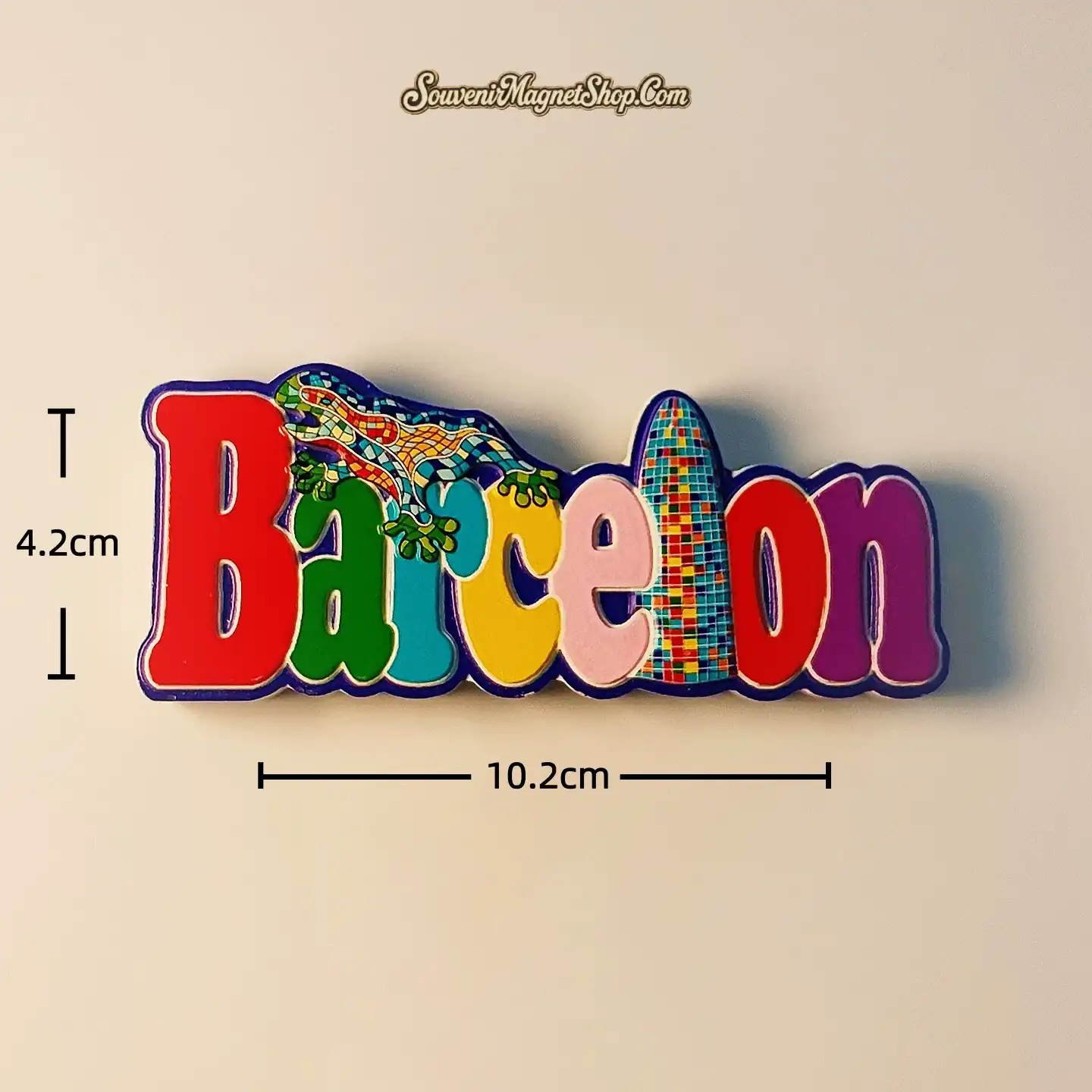 This premium fridge magnet features bold, 3D stereoscopic lettering spelling out ‘Barcelona’ in a spectrum of rainbow hues. Perched atop the letters is a meticulously detailed mosaic lizard, accompanied by a mosaic-patterned spire reminiscent of the city’s famous architectural towers.