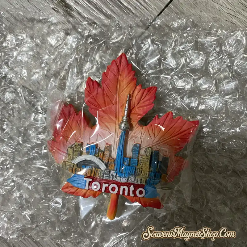 This exquisite 3D resin fridge magnet masterfully captures the essence of Toronto within the iconic shape of a Canadian maple leaf.