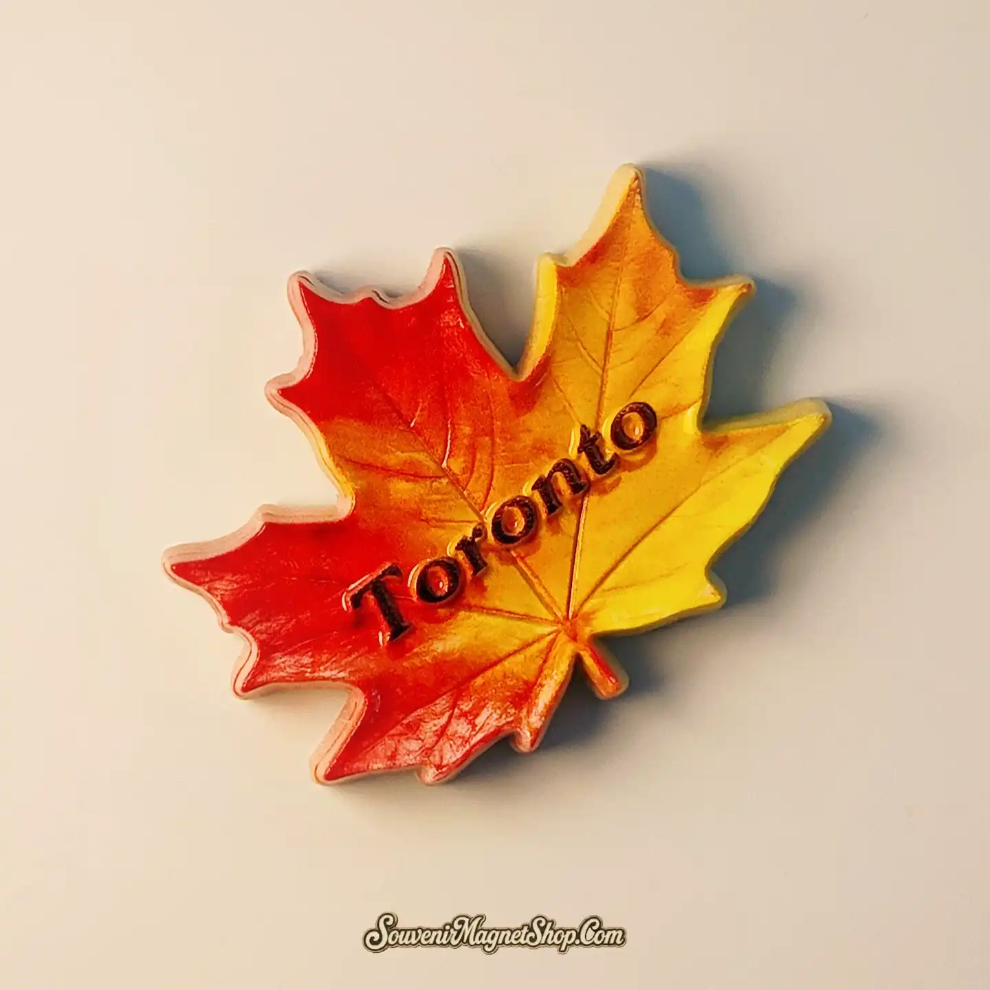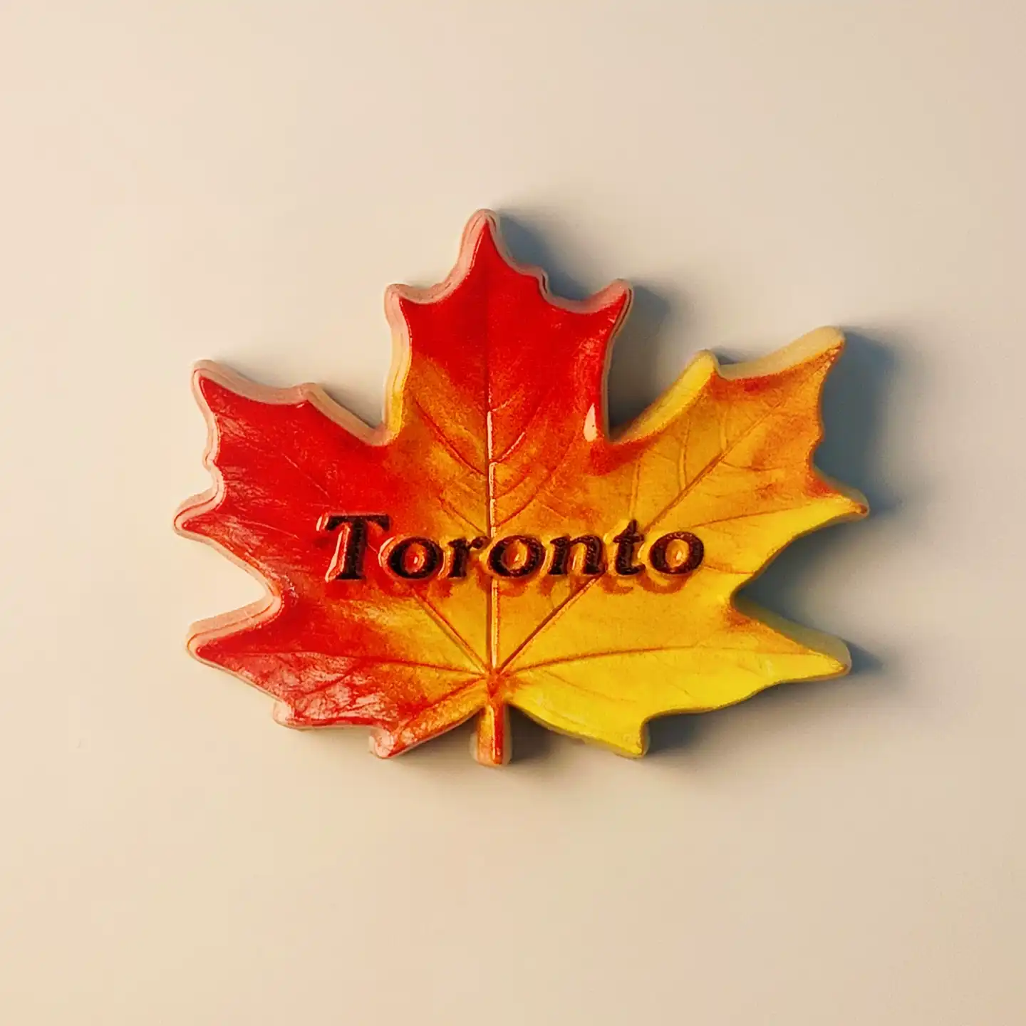The “Toronto” lettering is beautifully rendered in 3D, adding a tactile dimension that makes the magnet truly stand out. Hand-painted details bring the leaf’s natural veins to life, showcasing meticulous craftsmanship.