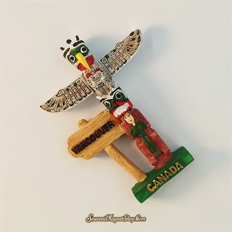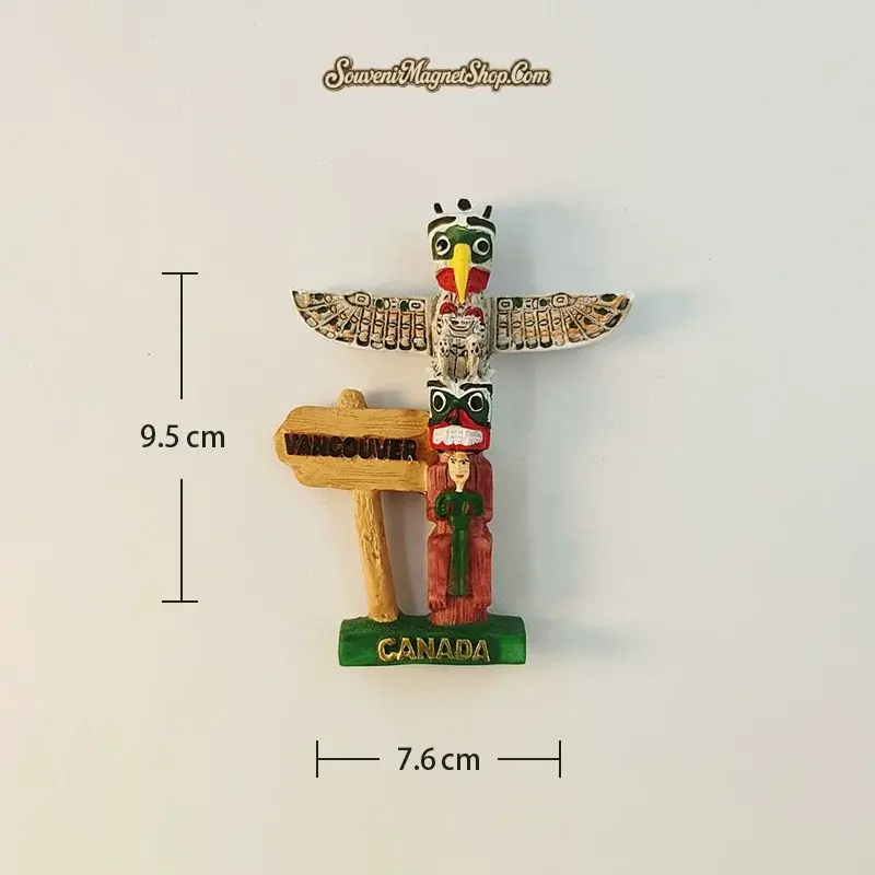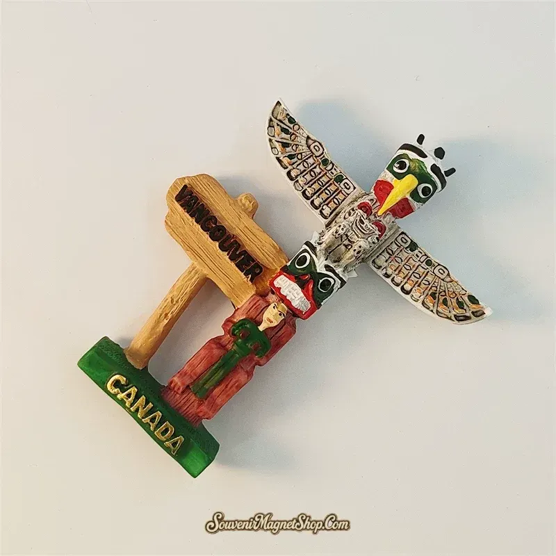 This fridge magnet captures that spirit in miniature — a stacked totem topped by a wide-winged eagle, with smaller spirit figures and a young woman carved into the post below. A wooden “VANCOUVER” sign and a green “CANADA” base anchor the whole piece with a clear sense of place.