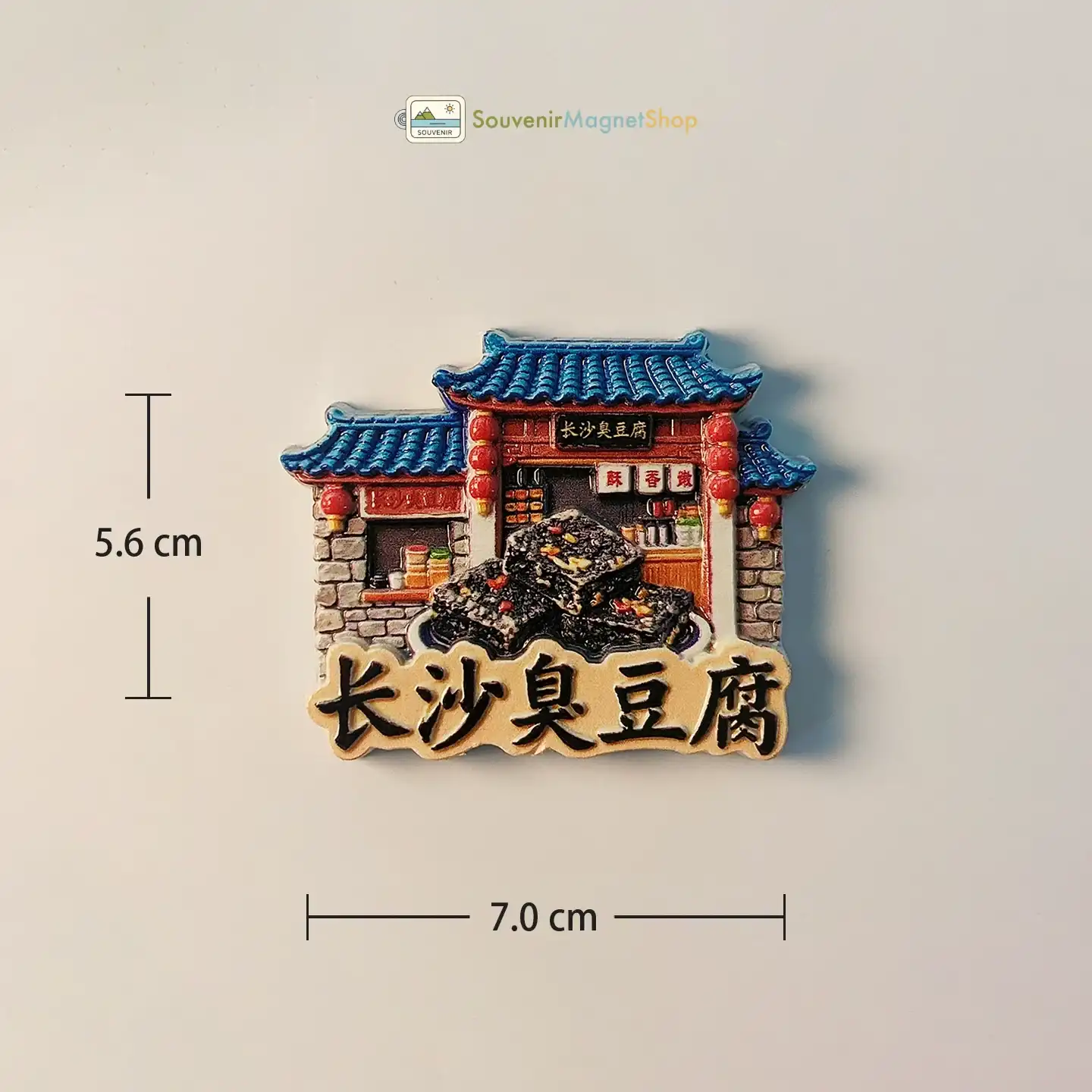 This charming 3D resin fridge magnet captures the essence of Changsha’s culinary heritage, depicting a traditional snack stall dedicated to the city’s renowned stinky tofu. Meticulously hand-painted, the magnet showcases intricate details like the classic tiled roof, vibrant red lanterns, and a prominent sign displaying “长沙臭豆腐” (Changsha Stinky Tofu), all framing a delectable stack of the famously fragrant snack.