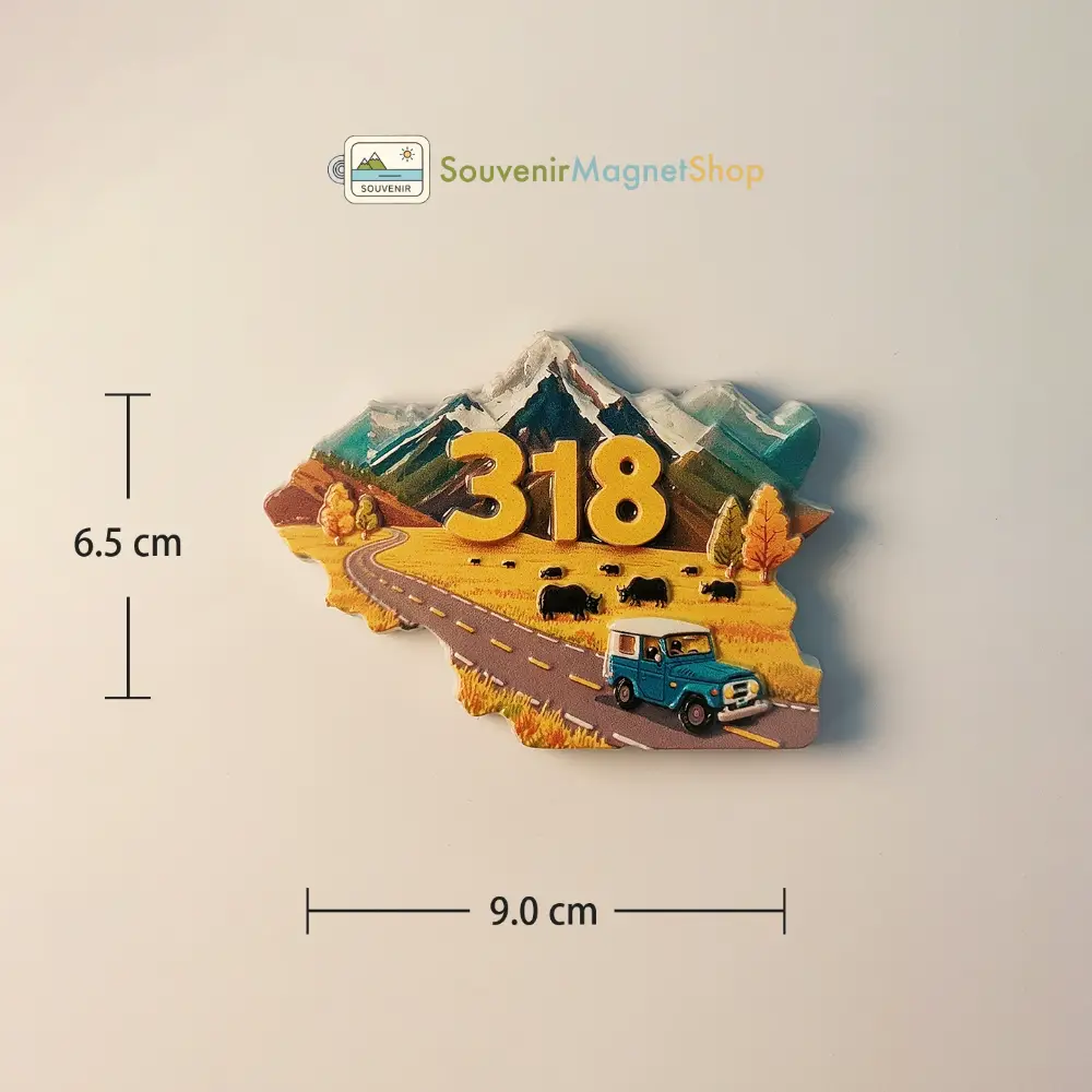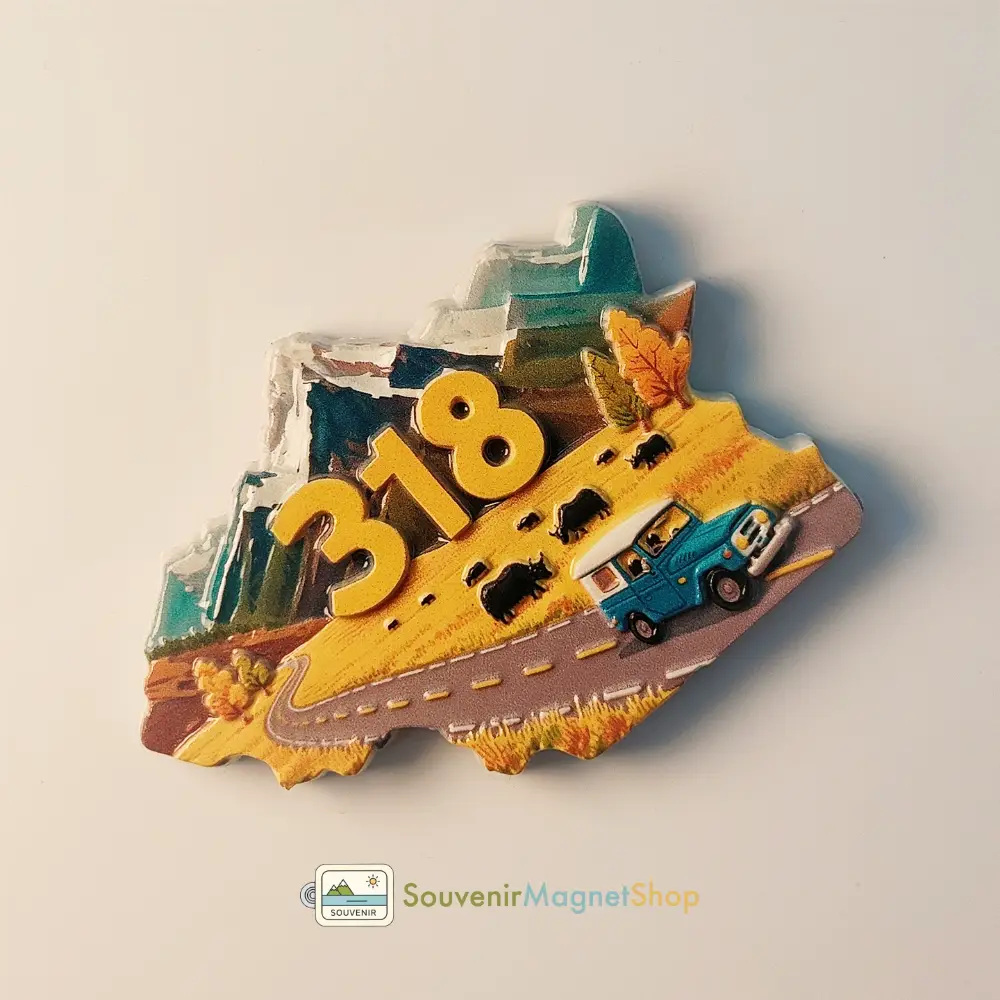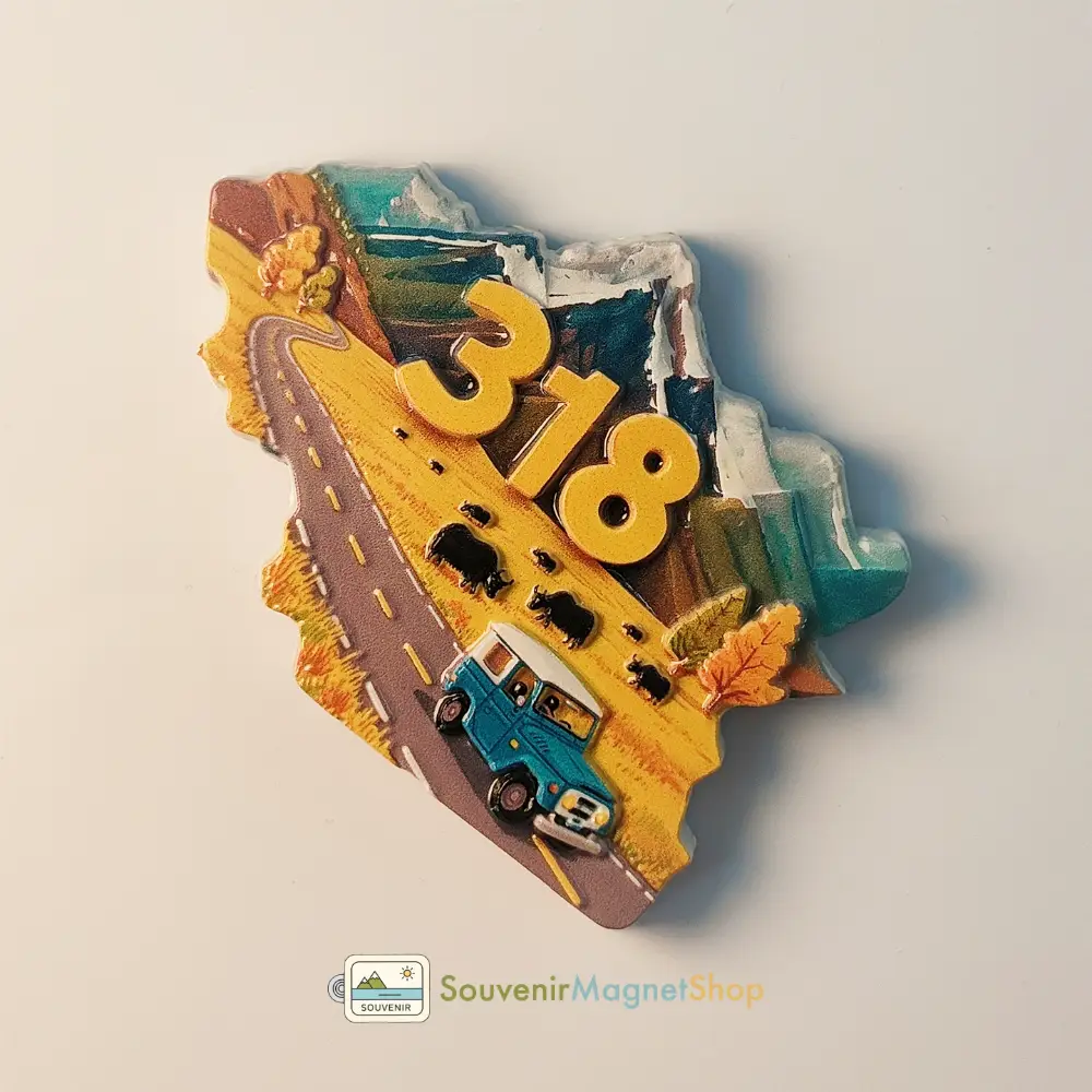 This souvenir fridge magnet features a creative 3D resin design of the 318 Highway, highlighting the snowy peaks and grassland scenery along the Sichuan-Tibet route. The vivid hand-painted details reflect the spirit of exploration and the majestic charm of the Tibetan Plateau.