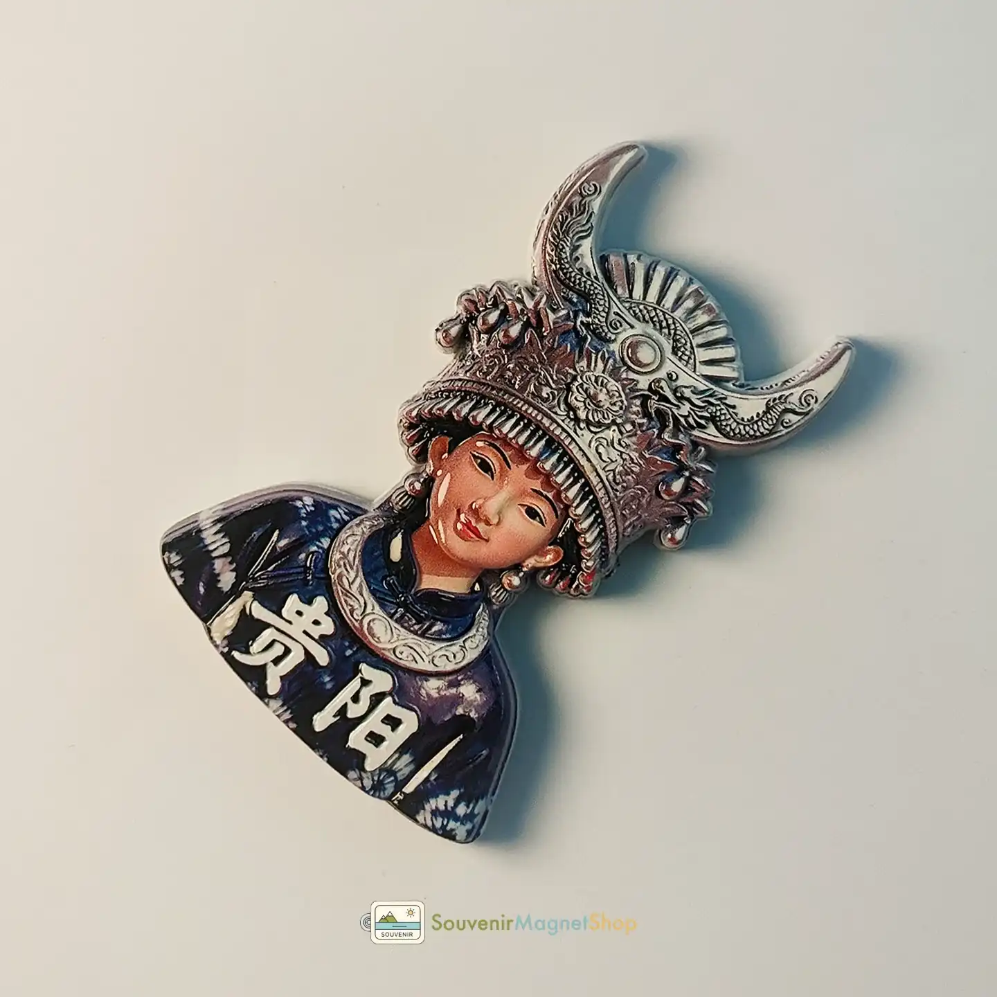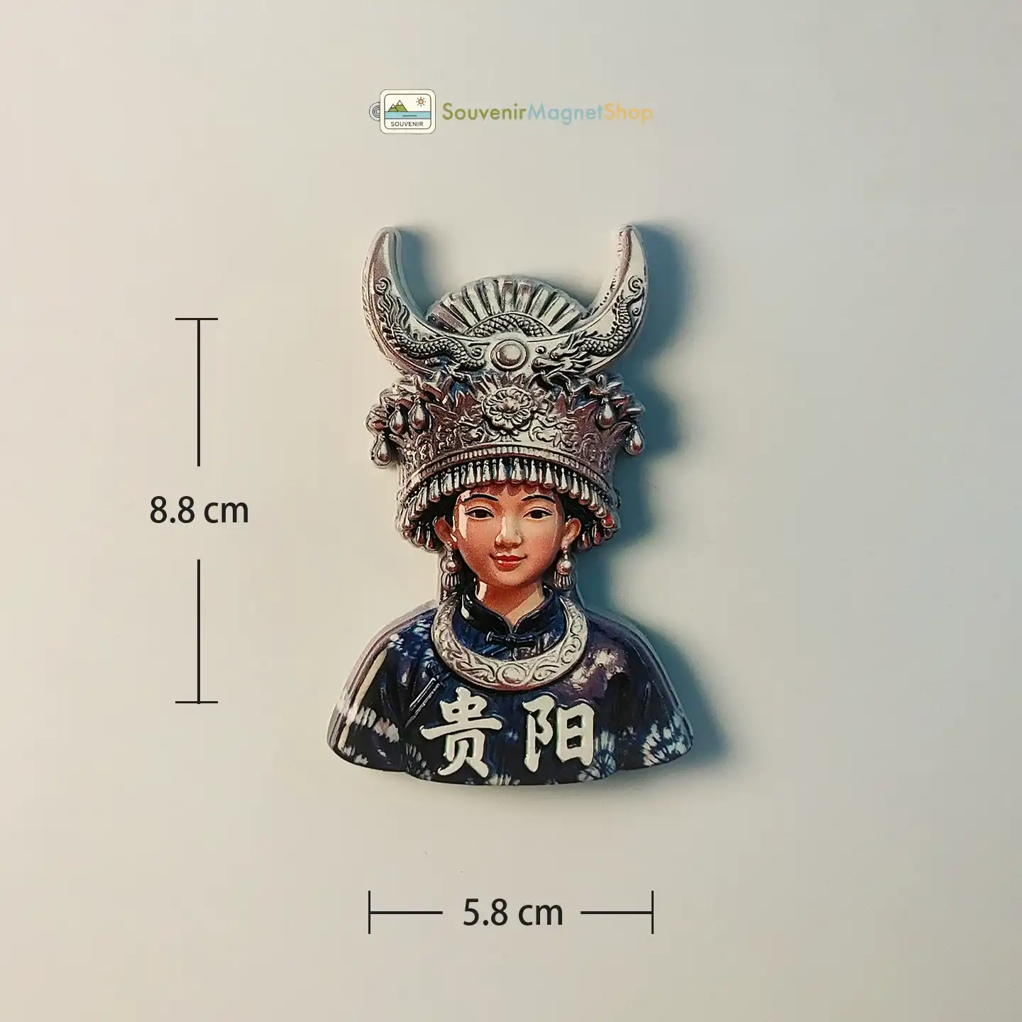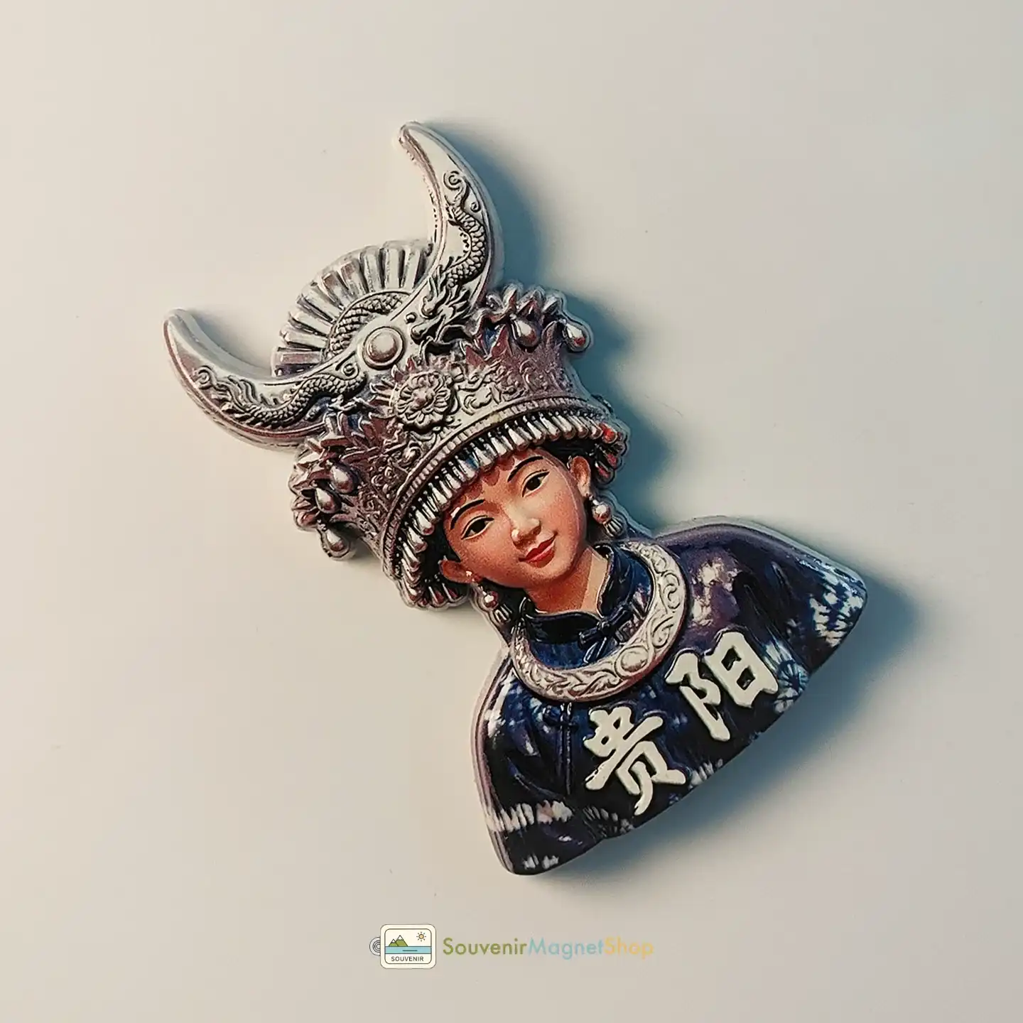 This captivating 3D resin souvenir magnet beautifully showcases the iconic culture of Guiyang, featuring a Miao girl adorned in her elaborate traditional silver headdress and distinctive indigo-dyed clothing.