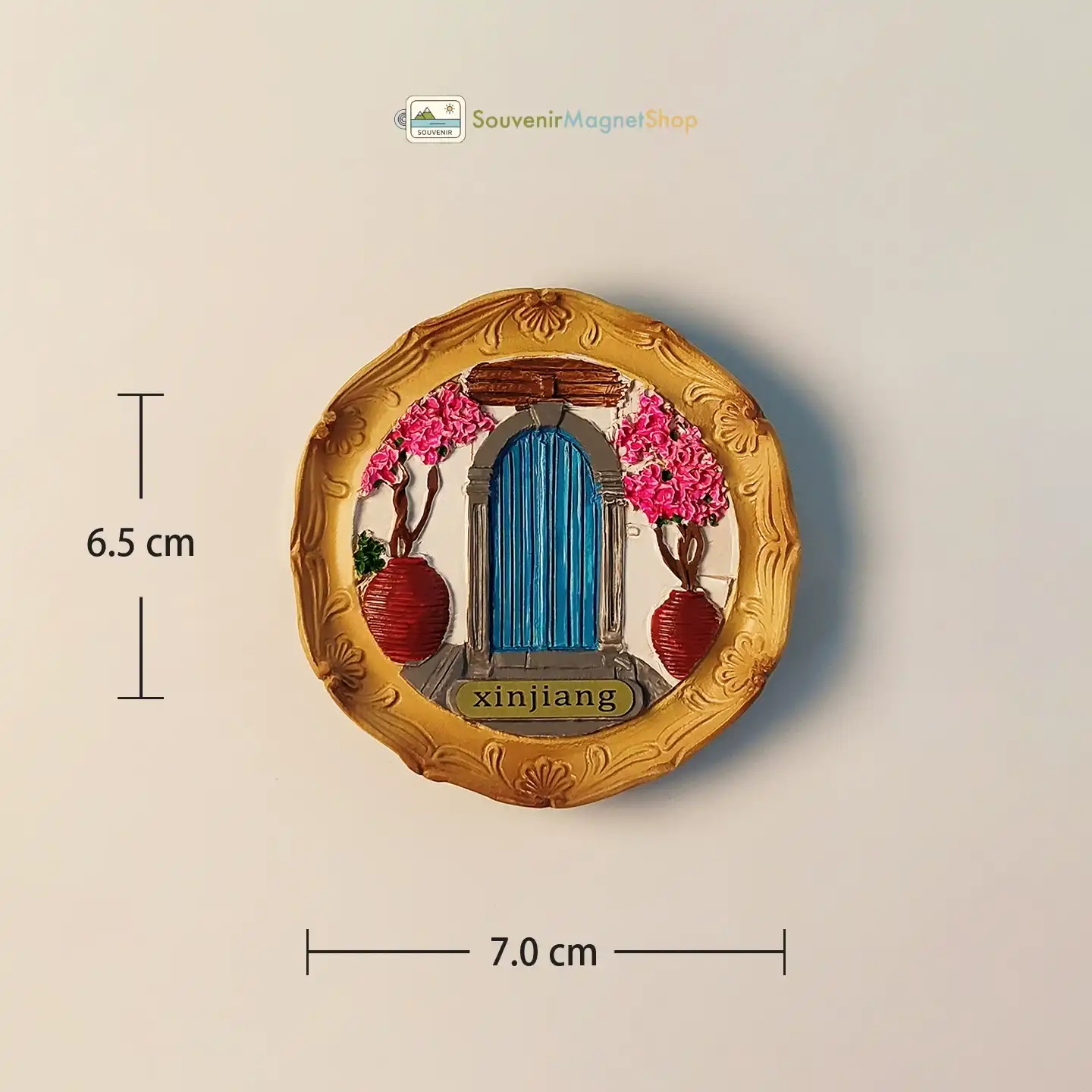 This 3D resin fridge magnet showcases Kashgar’s traditional house facade with a vibrant blue door, blossoming pink flowers, and hand-painted details, reflecting the city’s unique architectural charm.