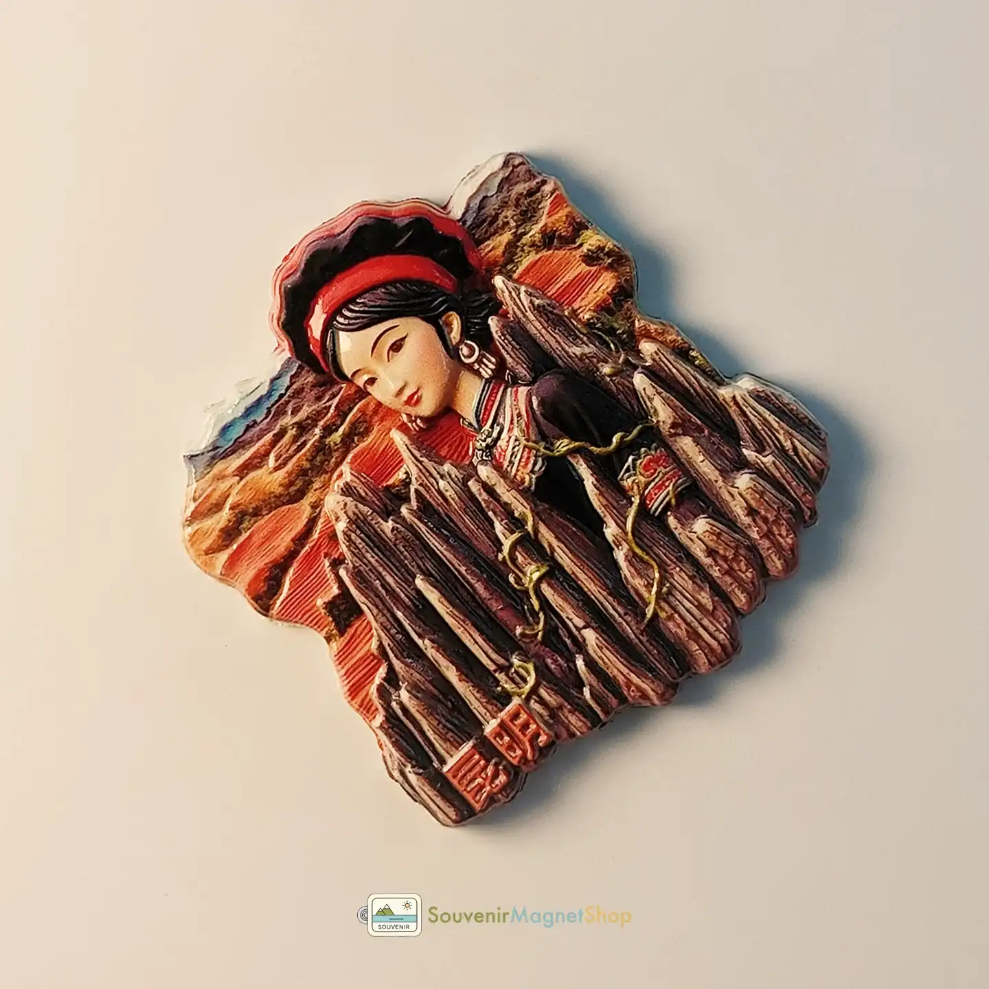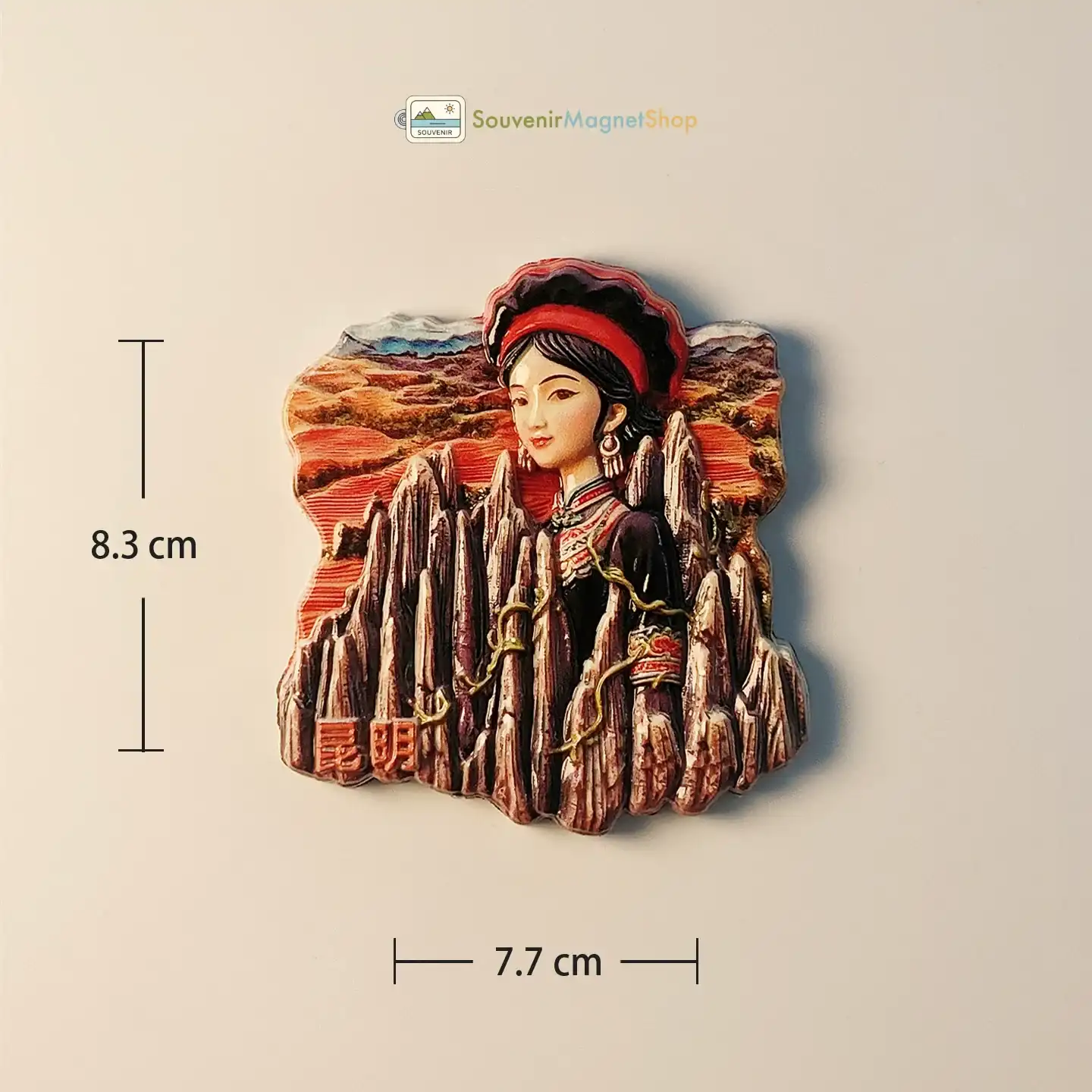 This 3D resin souvenir magnet features a beautiful Sani woman from the Yi ethnic group, elegantly integrated with the distinctive karst formations of the Stone Forest.