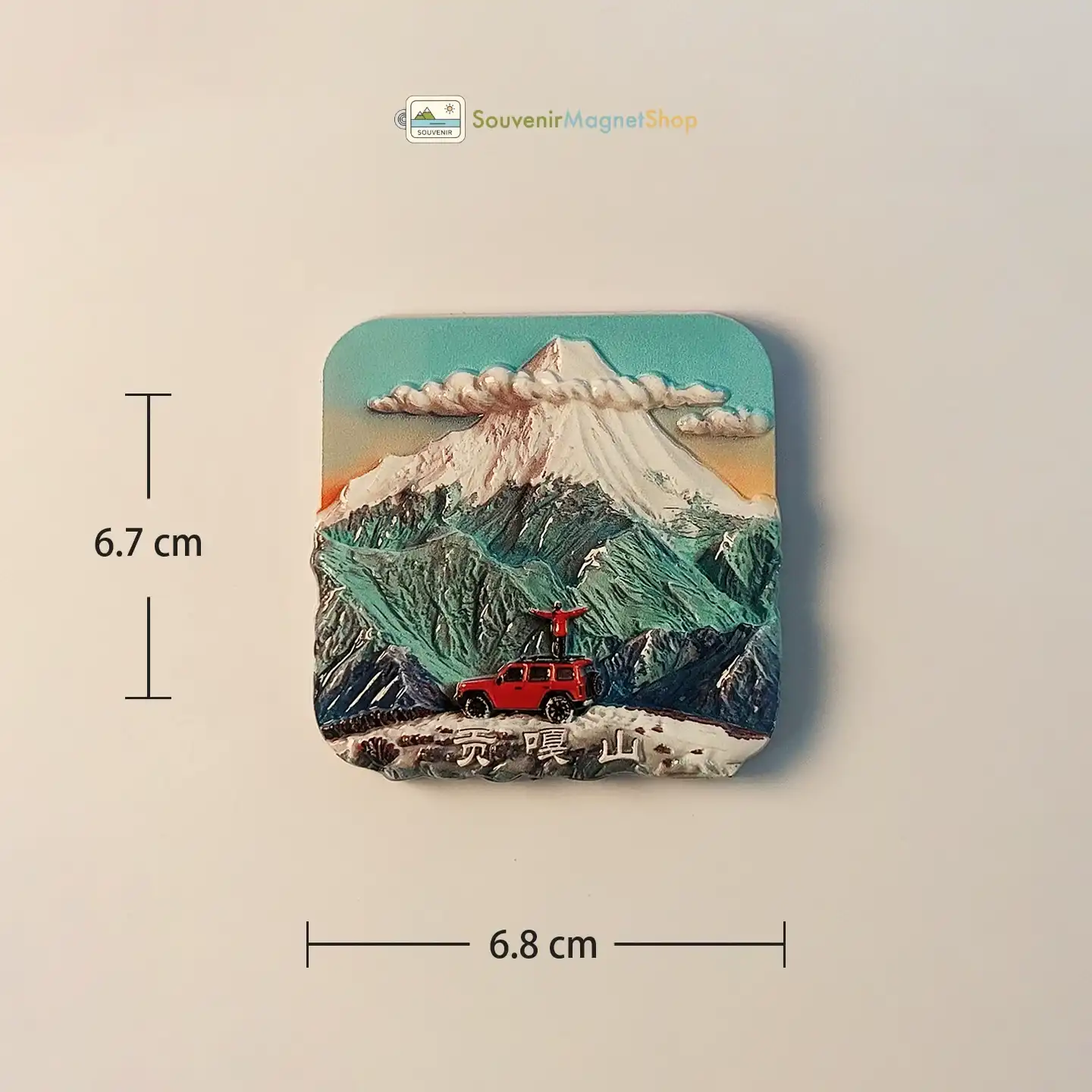 Souvenir Magnets of China’s Mount Gongga, featuring its snow-capped peak, rugged slopes, a red off-road vehicle, and “贡嘎山” (Gongga Shan) text. A vibrant, hand-painted fridge magnet capturing the King of Shu Mountains.