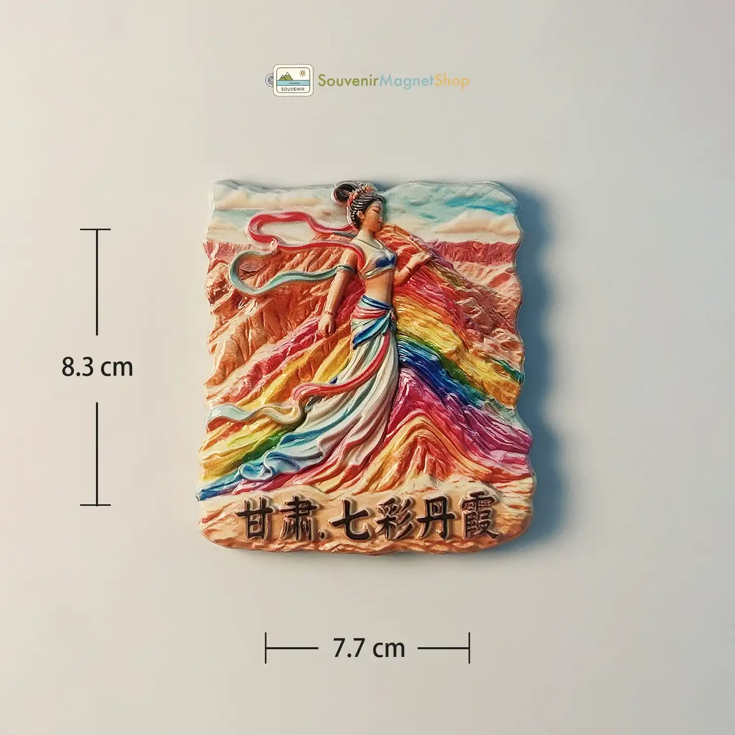 The creative flying Apsara figure, a celestial being from Chinese mythology, gracefully floats above the colorful landscape, symbolizing harmony and artistic wonder, making it a unique Zhangye Rainbow Mountains souvenir magnet.