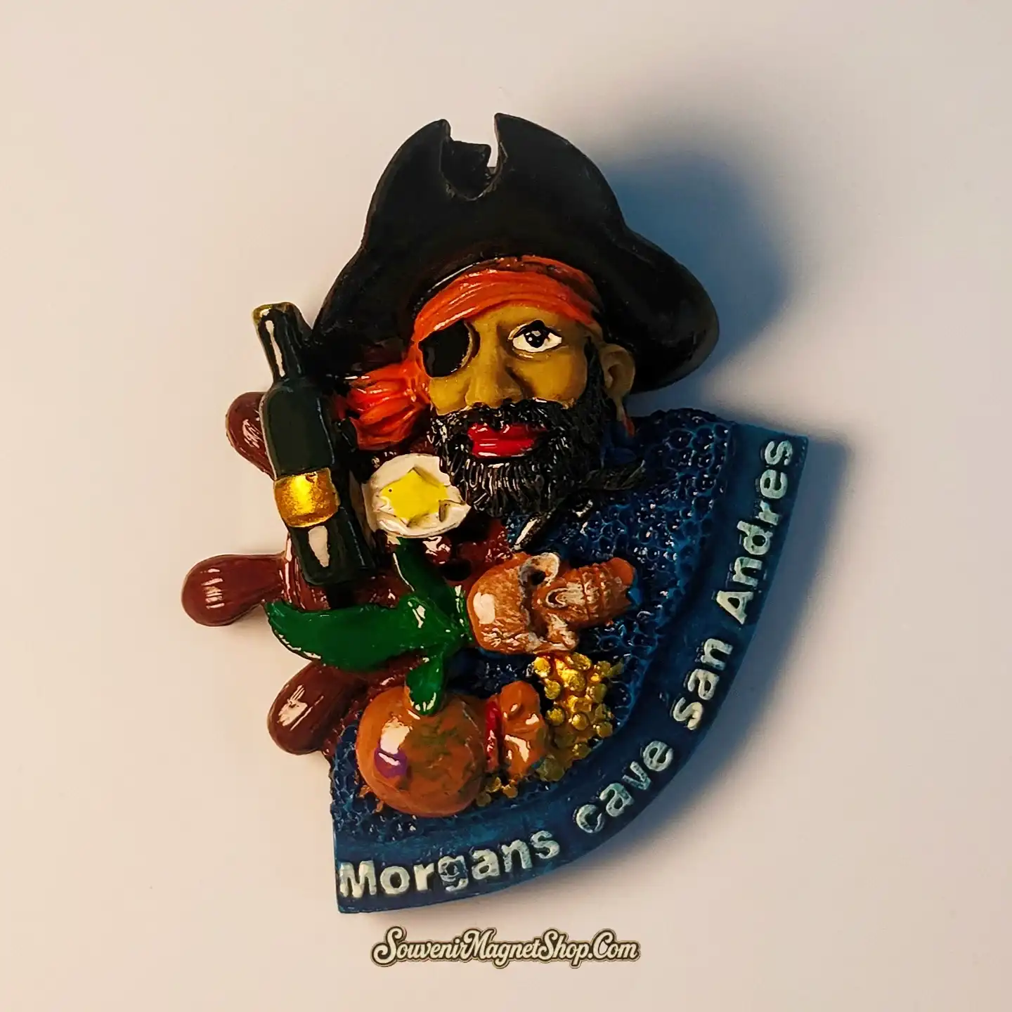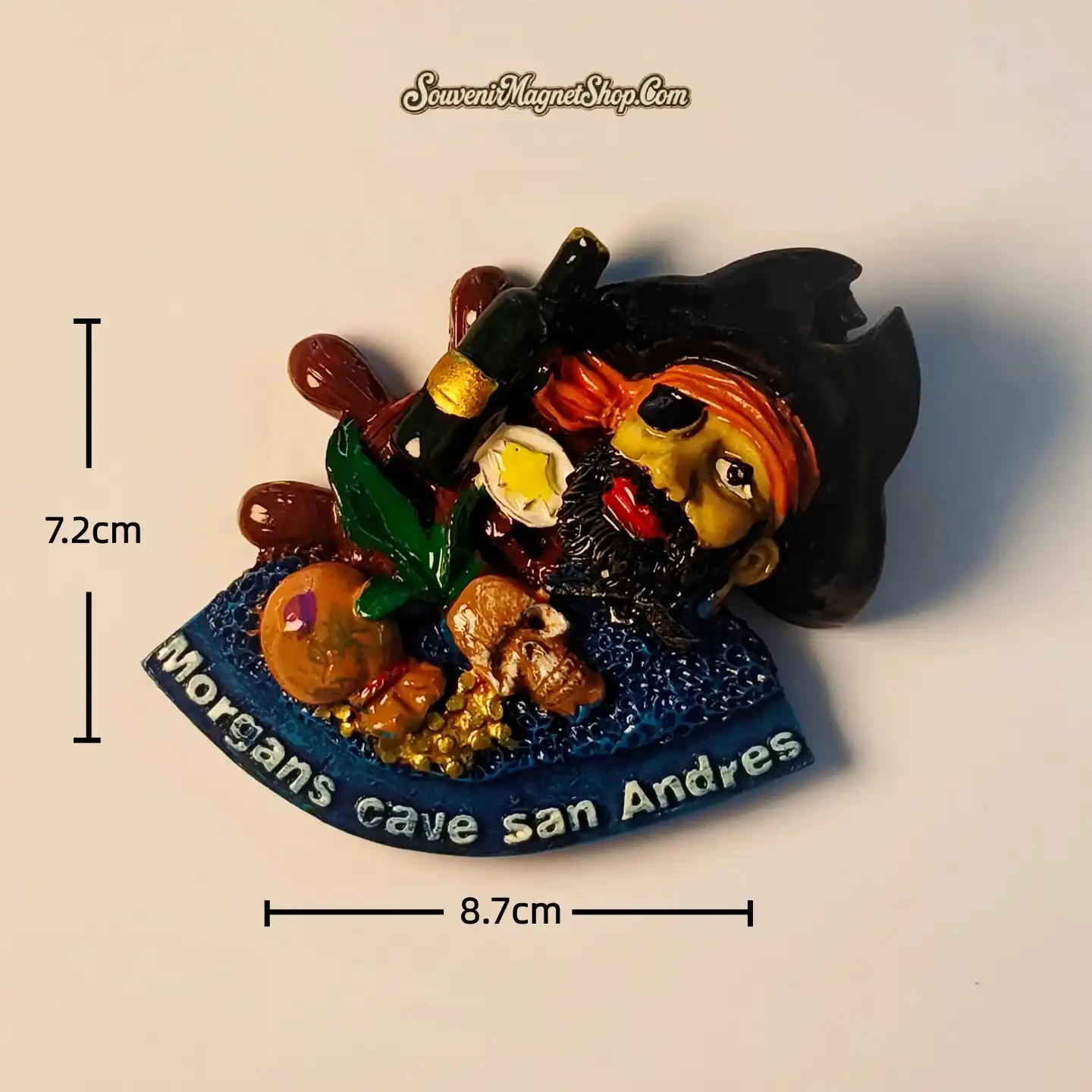 Each piece is hand-painted to highlight the rugged details of the pirate’s gear and the treasure he guards, with the “Morgans cave san Andres” inscription clearly displayed.