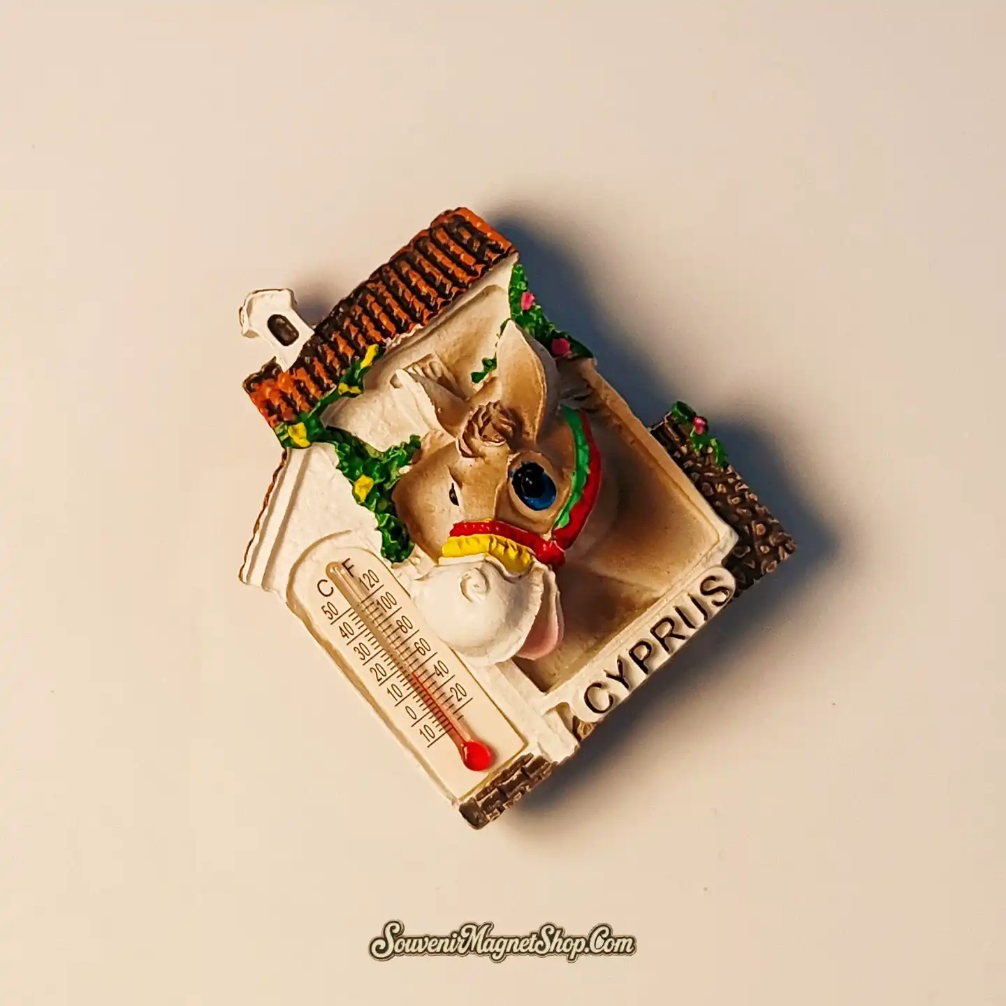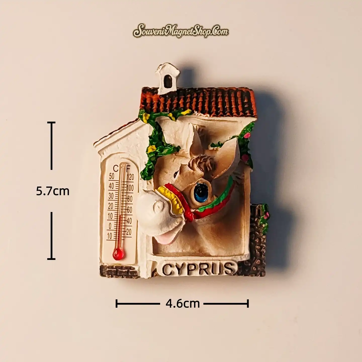 This beautifully crafted 3D resin fridge magnet brings the heart of Cyprus to life with its vibrant hand-painted details. It intricately showcases a charming folk house, adorned with typical Mediterranean elements, from which a friendly Cypriot donkey playfully peeks out.