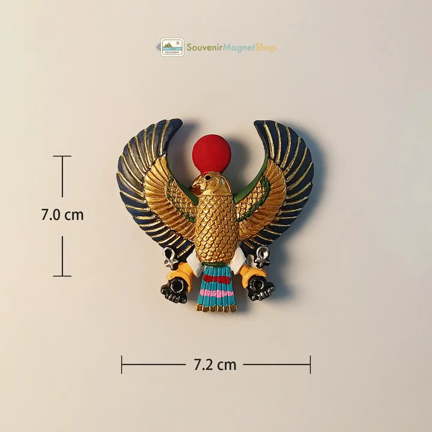 Majestic 3D resin Horus God fridge magnet, hand-painted with golden feathers, blue wings & red sun disk. A unique Egyptian mythology souvenir magnet.