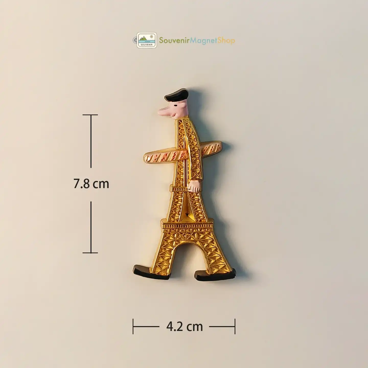 This Zinc alloy, hand-painted Souvenir Magnet features a walking Eiffel Tower, wearing a beret and holding a baguette, a creative Paris fridge magnet.