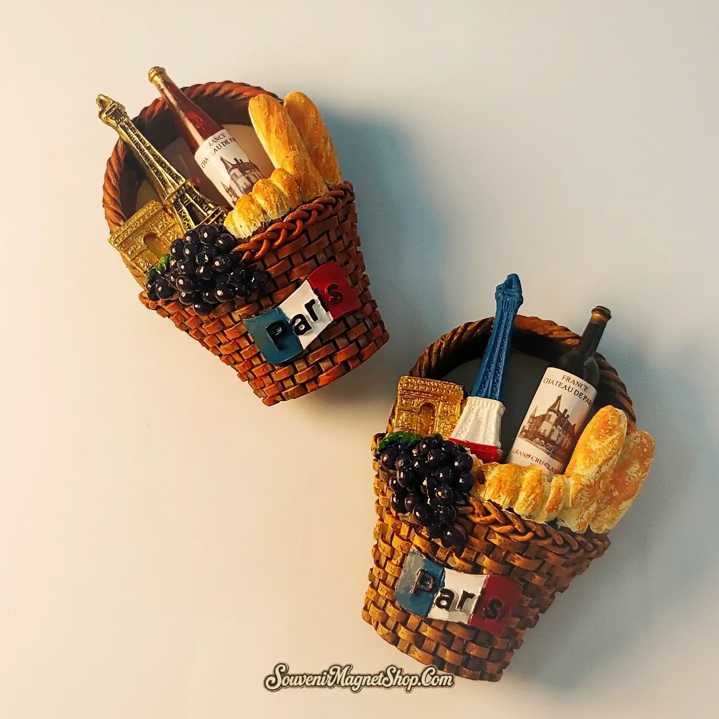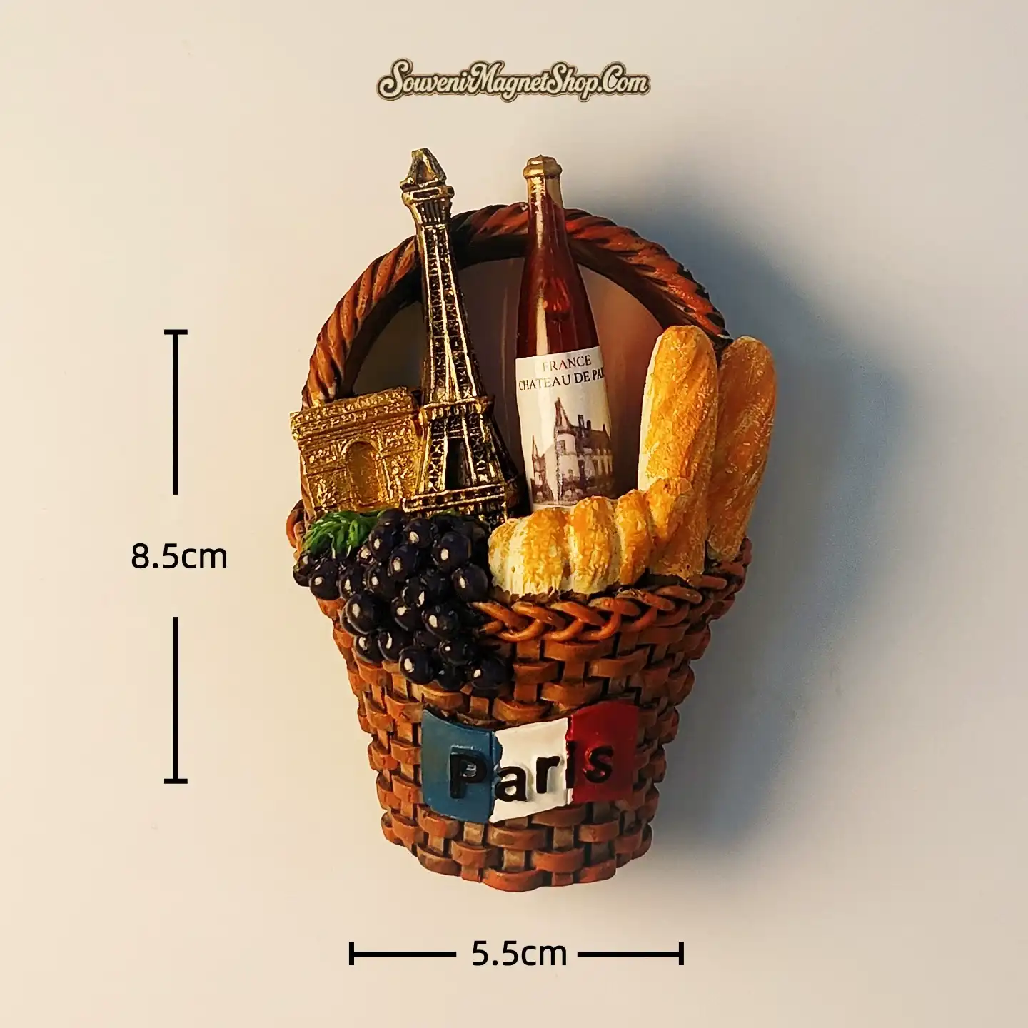 This exquisitely designed 3D souvenir fridge magnet brings the vibrant spirit of Paris right into your home. Meticulously hand-painted, it features a charming woven basket overflowing with miniature renditions of the Arc de Triomphe and Eiffel Tower, nestled alongside a bottle of French wine, bunches of juicy grapes, and golden, crusty baguettes.