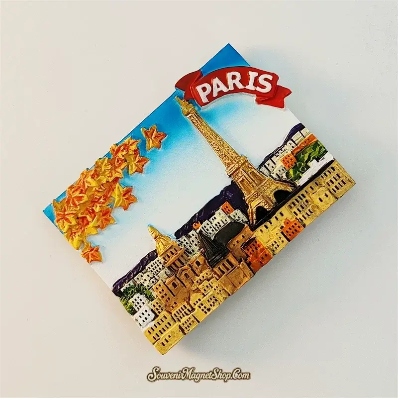 This souvenir fridge magnet captures that specific mood of Paris en automne. The warm palette — golden buildings, amber rooftops, burnt-orange maple leaves cascading from the upper corner — feels less like a postcard and more like a memory of an afternoon walk along the Left Bank in October.