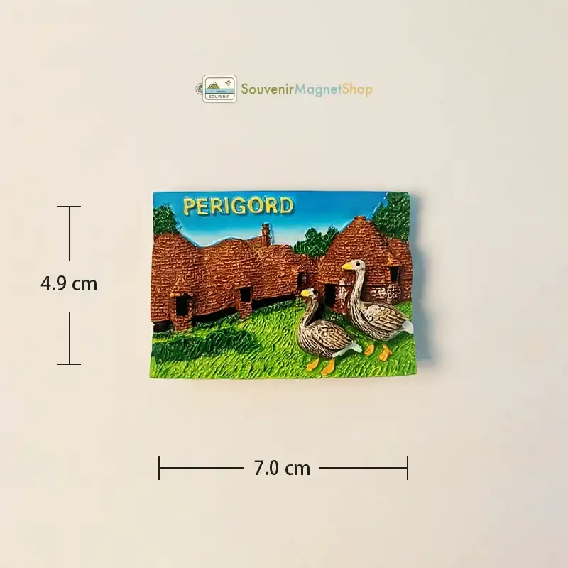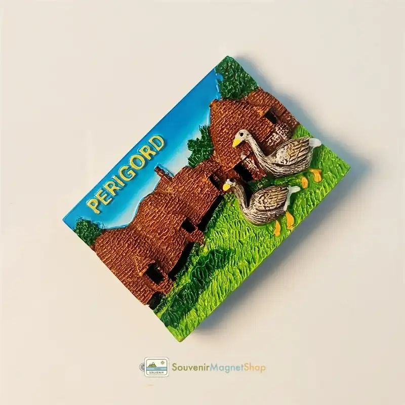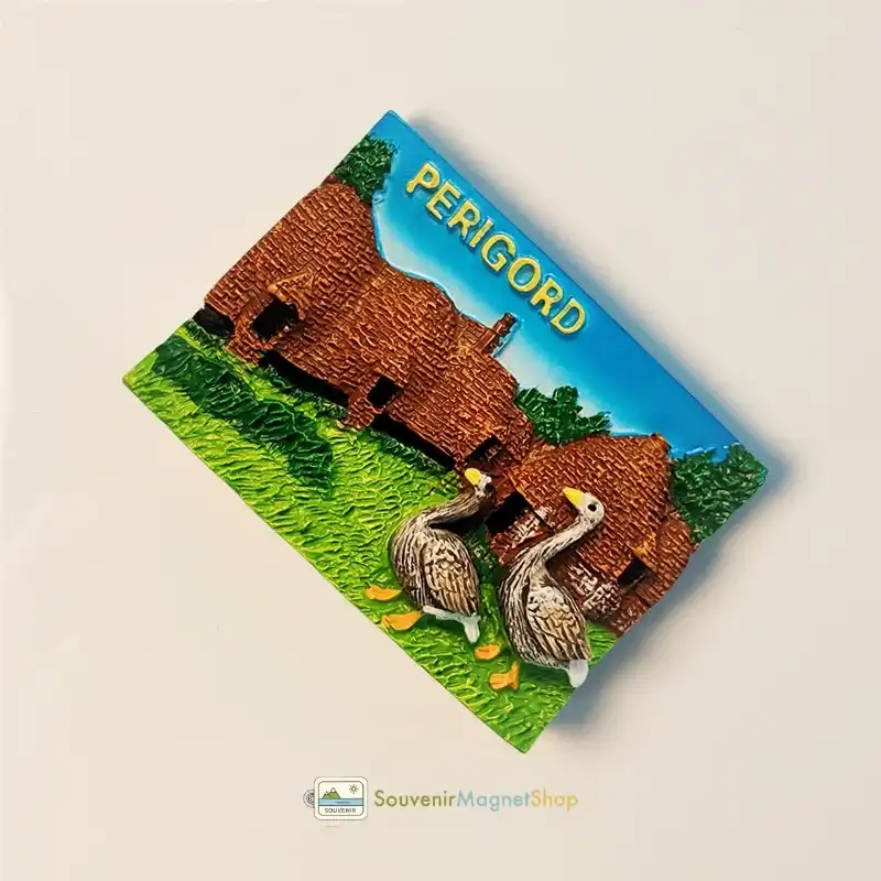 Capturing Perigord’s idyllic charm, this 3D Perigord resin magnet features hand-painted thatched cottages and graceful ducks in a serene French countryside scene.