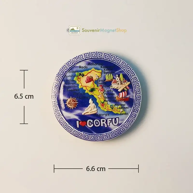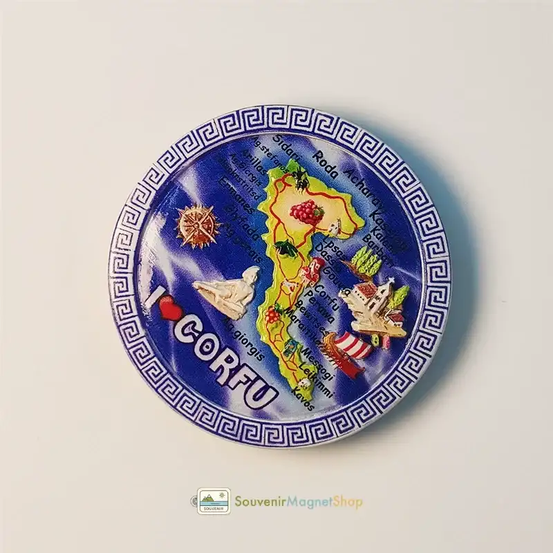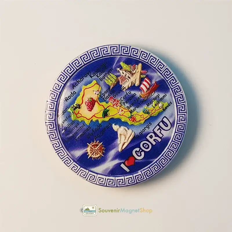 This beautifully crafted 3D resin fridge magnet features a detailed map of Corfu. It’s hand-painted to highlight the island’s key locations, set against a deep blue background reminiscent of the Ionian Sea.