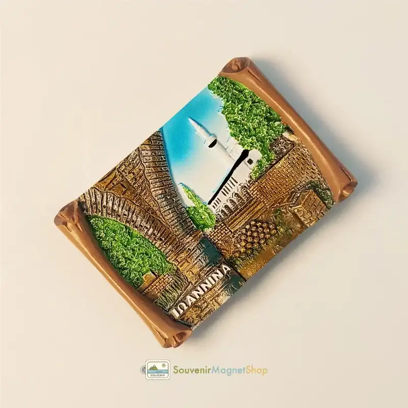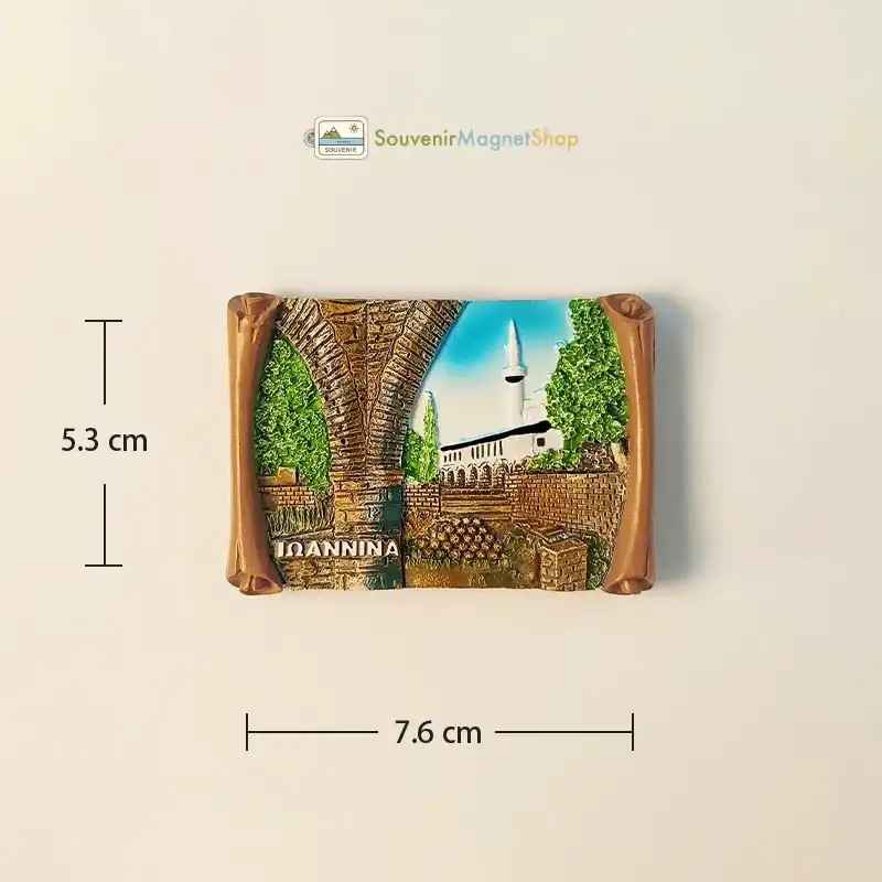 Explore Ioannina’s historic castle and mosque minaret with this detailed 3D resin fridge magnet, featuring hand-painted architectural beauty and scroll design. Great Souvenir Magnets.