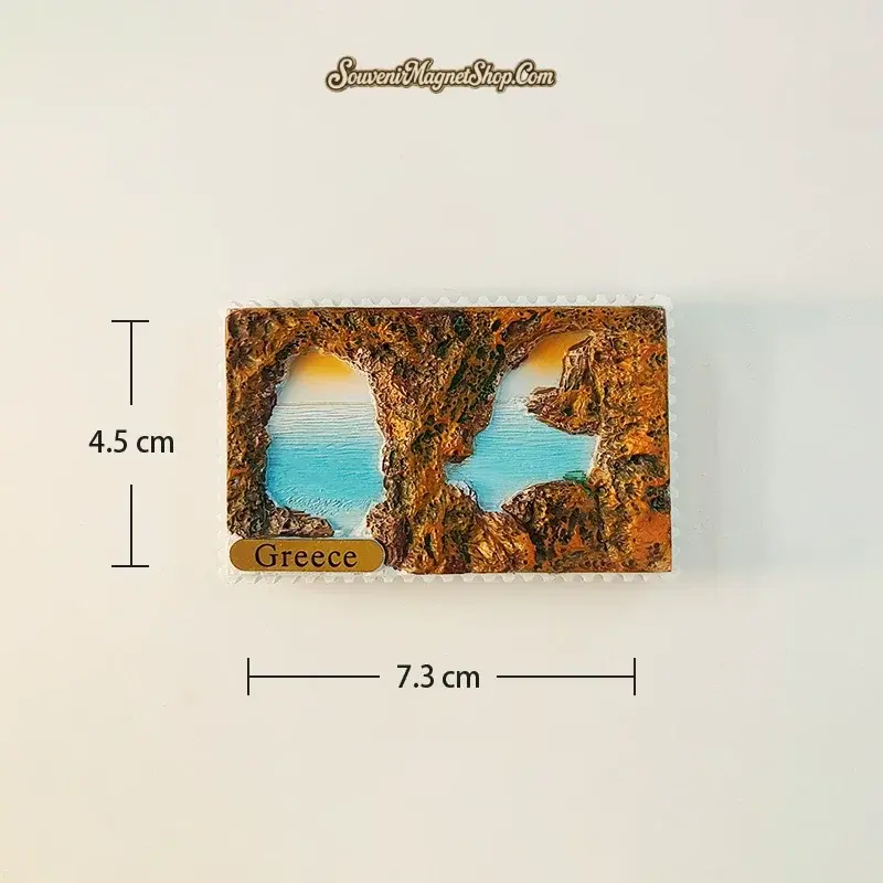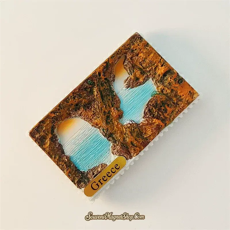 This beautifully crafted 3D resin fridge magnet recreates the iconic Kleftiko sea caves in vivid detail. The textured brown and orange rock formations frame two natural arch openings, revealing the signature turquoise waters and warm sunset sky beyond. A golden “Greece” nameplate adds an elegant finishing touch to the stamp-shaped design.