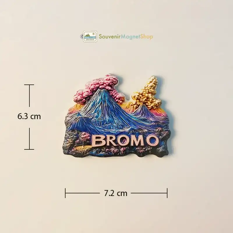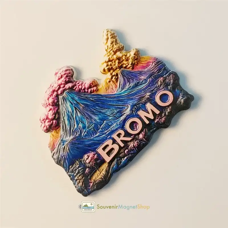 Stunning 3D resin Bromo Volcano eruption fridge magnet, hand-painted with vibrant blues, purples, and fiery plumes. Iconic “BROMO” lettering.