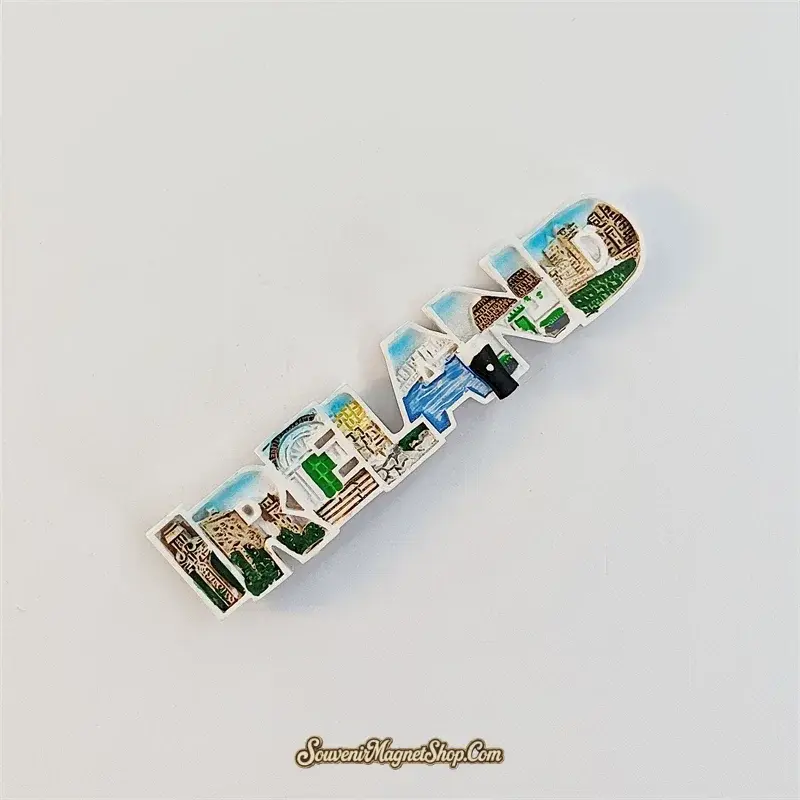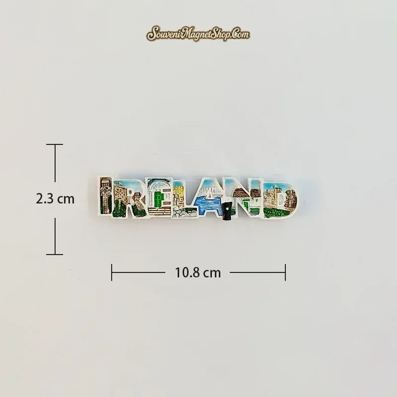 This fridge magnet spells out “IRELAND” in bold 3D letters, with each letter hand-painted to showcase a different landmark or scene from across the country. You’ll spot round towers, arched bridges, coastal cliffs, lush greenery, and city skylines — all packed into a single, eye-catching design.