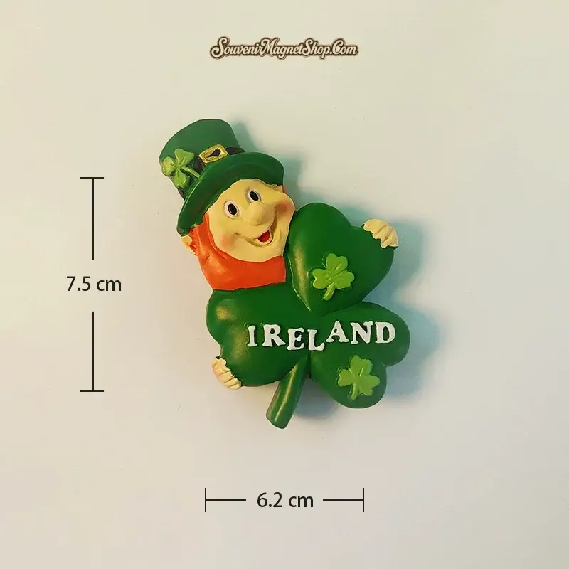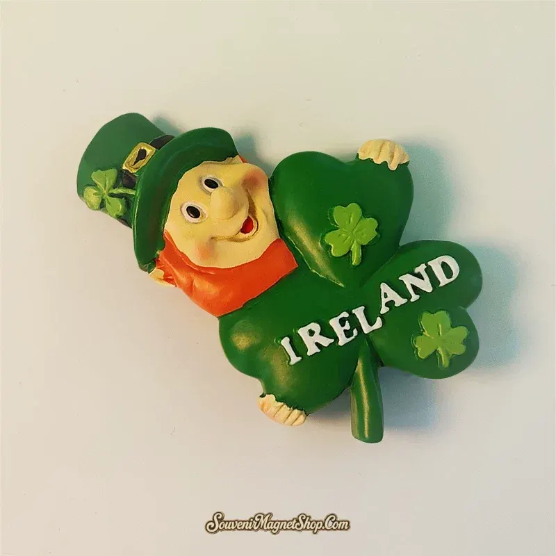 This captivating fridge magnet embodies the heart of Irish culture, featuring the legendary leprechaun, a mischievous fairy known for guarding a pot of gold at the end of the rainbow, alongside the iconic shamrock, a symbol of luck and the Holy Trinity.