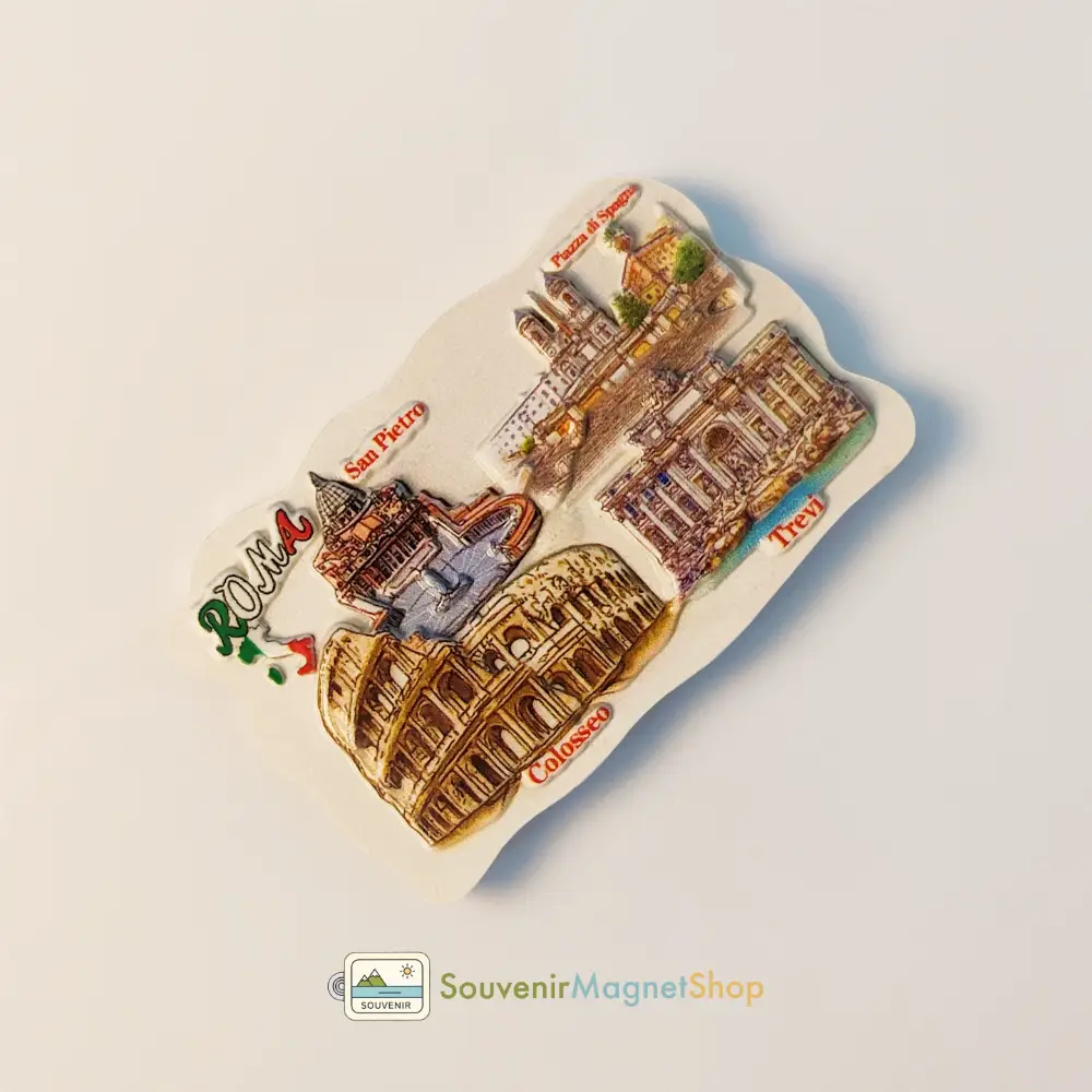 This souvenir fridge magnet features a creative 3D resin design with four of Rome’s most iconic landmarks, including the Colosseum, the Pantheon, St. Peter’s Basilica, and other historic sites. The detailed hand-painted finish beautifully captures the grandeur of Rome’s architecture, making it a remarkable collectible.