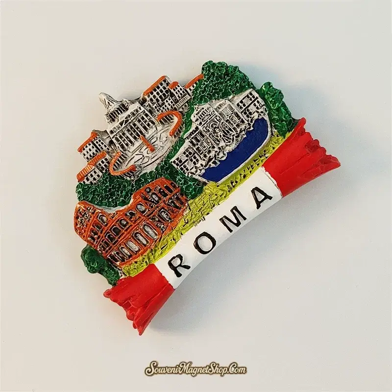 Each magnet is sculpted in resin and hand-painted with crisp orange brick on the Colosseum, soft silver-gray stone for the Vatican and Trevi, lush green ivy, and a warm yellow ground. A glossy finish keeps the colors looking bright over time.