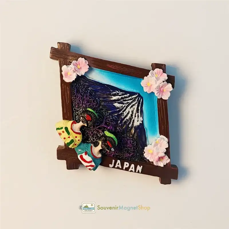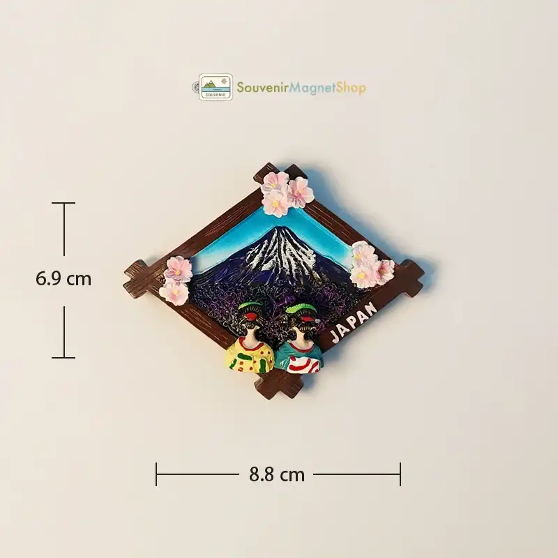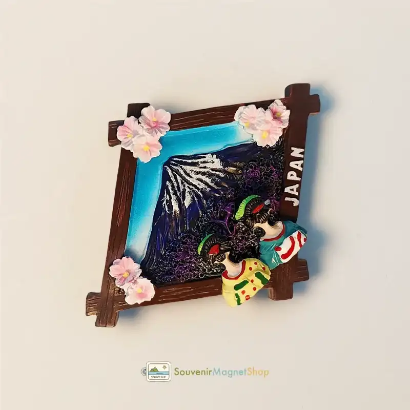 Celebrate Japan with this 3D resin Mount Fuji and kimono women fridge magnet. Features hand-painted details and a unique wooden frame, making it a perfect Japanese souvenir.