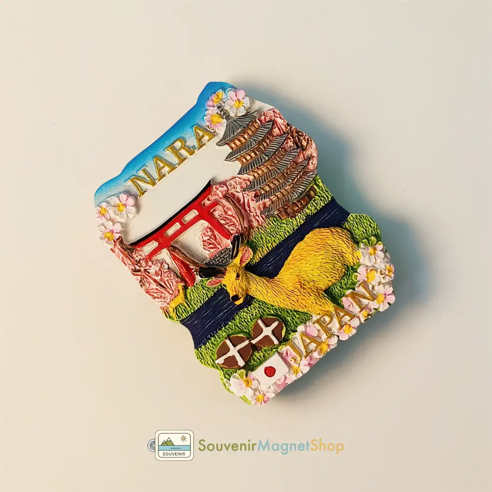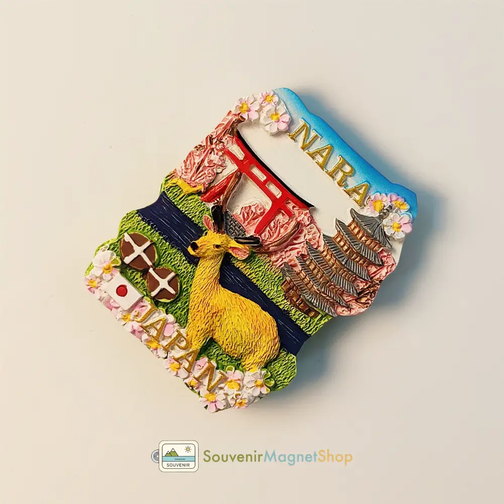 This souvenir fridge magnet features a creative 3D resin design showcasing Nara’s iconic elements — the friendly deer, the red torii gate, and the majestic five-story pagoda. Each detail is finely hand-painted, capturing the harmony between nature and tradition that defines Nara.