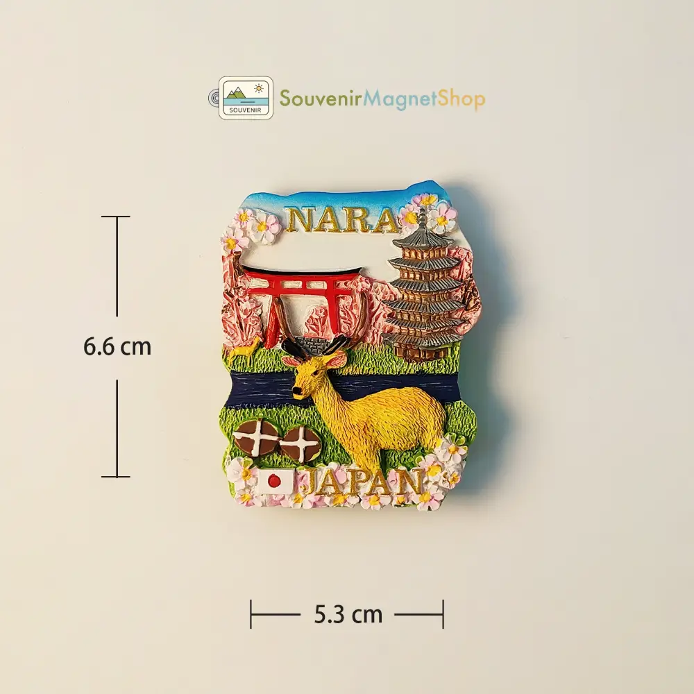 Explore Japan’s historic Nara with this vibrant fridge magnet! Featuring the iconic Nara Deer, traditional Torii gate, and a majestic Five-Story Pagoda. A perfect souvenir!