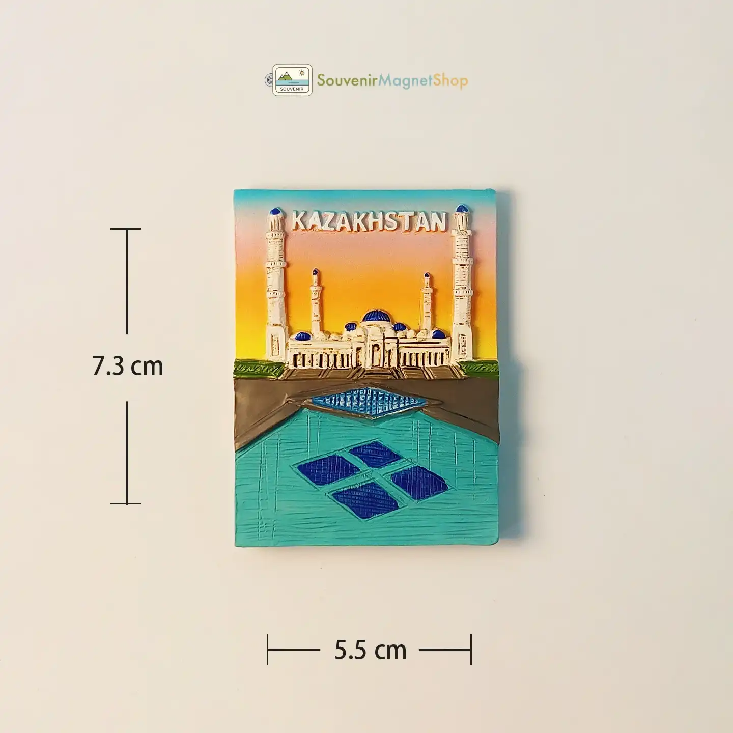 Commemorate your travels to Kazakhstan with this detailed fridge magnet featuring a prominent landmark mosque. A perfect souvenir or gift for enthusiasts of Kazakh culture and architecture.