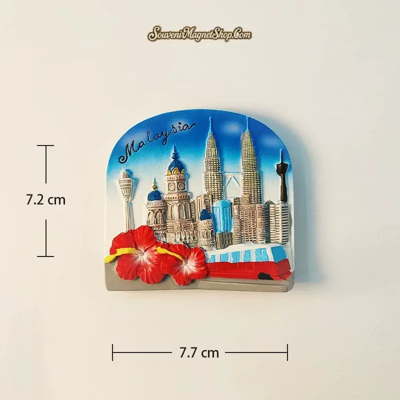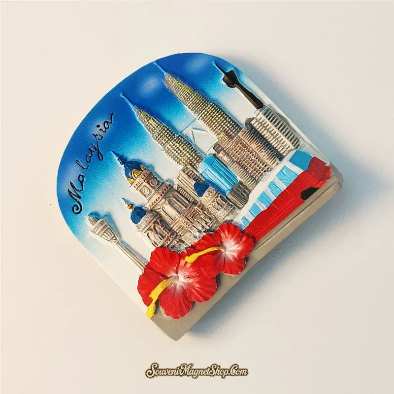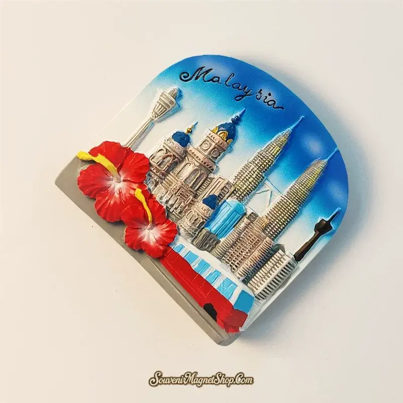 This intricately hand-painted souvenir magnet captures the essence of Kuala Lumpur in stunning 3D relief. Witness the iconic Petronas Twin Towers and the commanding KL Tower, meticulously recreated with architectural detail. Below, the lush, red petals of the Hibiscus burst forth, adding a touch of natural splendor. The word ‘Malaysia’ is elegantly inscribed, cementing this piece as a genuine memento from your journey.