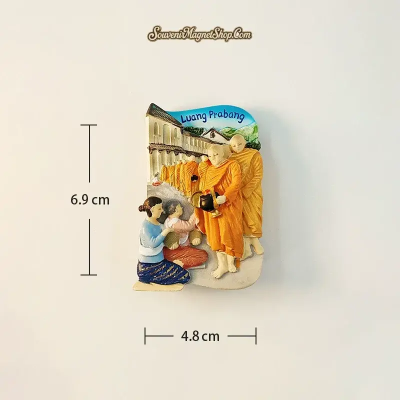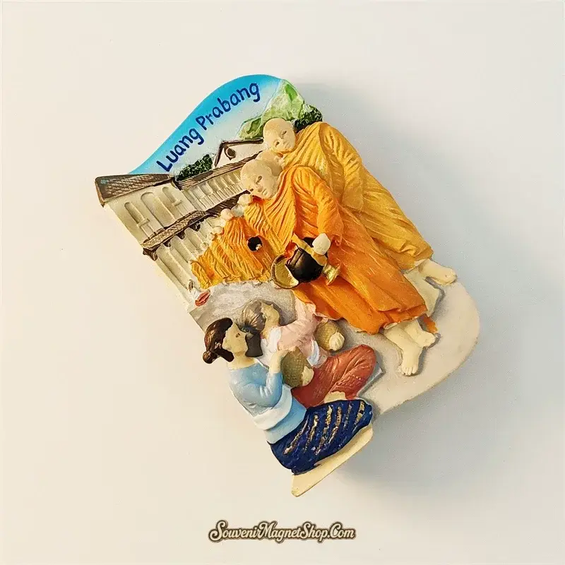 Hand-Painted 3D Luang Prabang Alms Giving Souvenir Magnet — Buddhist Monks Cultural Scene