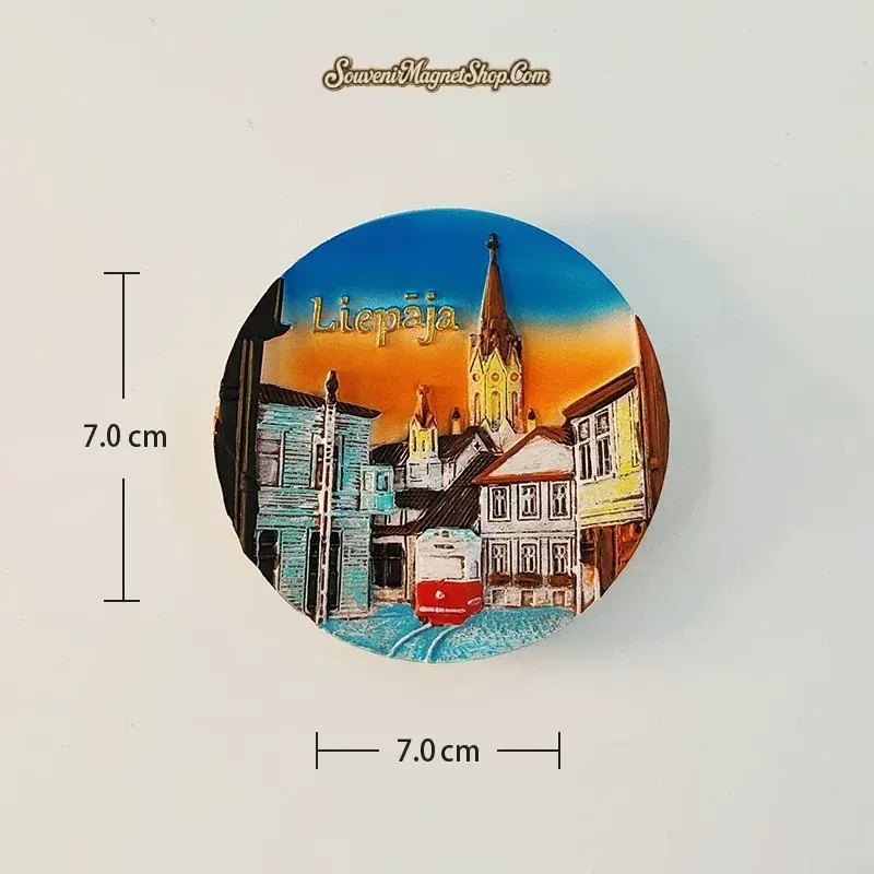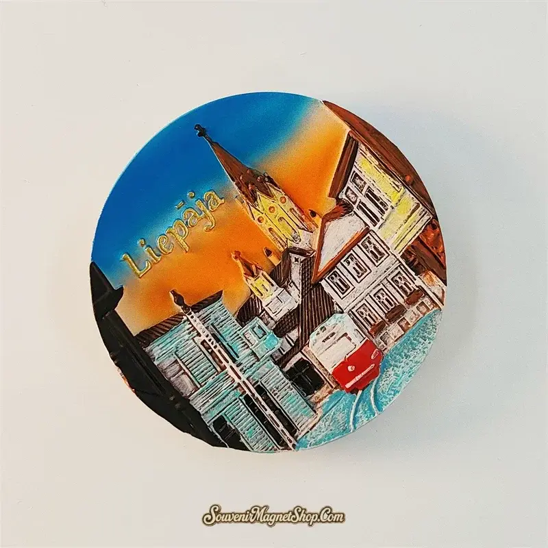 This round fridge magnet brings the magic of Liepāja to life in stunning 3D relief. The vibrant scene captures a classic city street bathed in a warm orange-and-blue sunset sky, with teal-painted historic wooden buildings lining the cobblestones, a bright red tram rolling through the center, and the Gothic church spire rising dramatically above the rooftops.