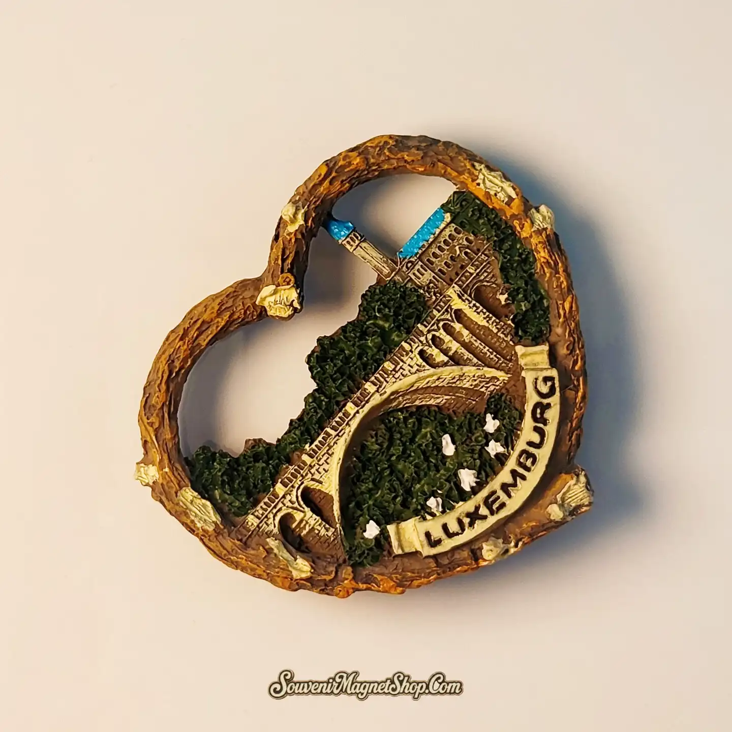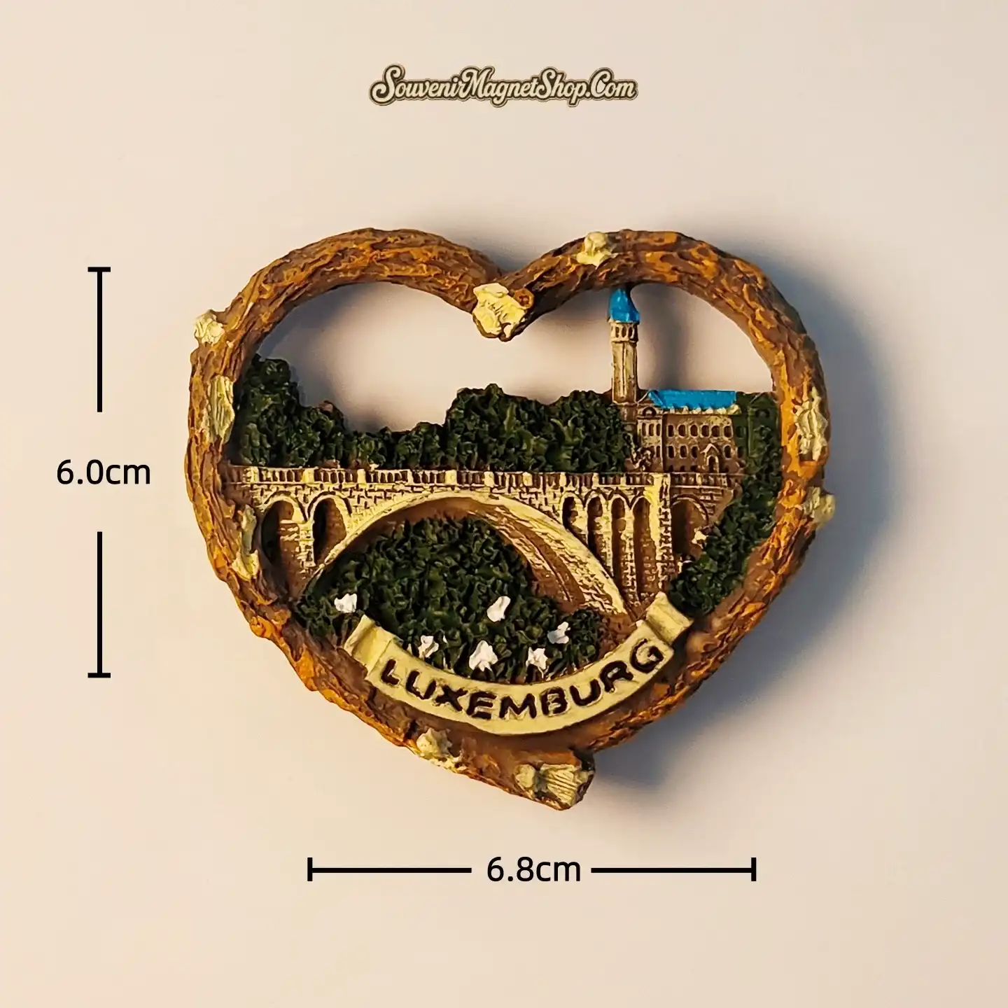 This exquisite heart-shaped souvenir magnet beautifully captures the essence of Luxembourg City in stunning 3D. Meticulously hand-painted, it depicts the arched elegance of the Adolphe Bridge surrounded by lush greenery, leading towards the distinctive blue spire of Notre-Dame Cathedral.