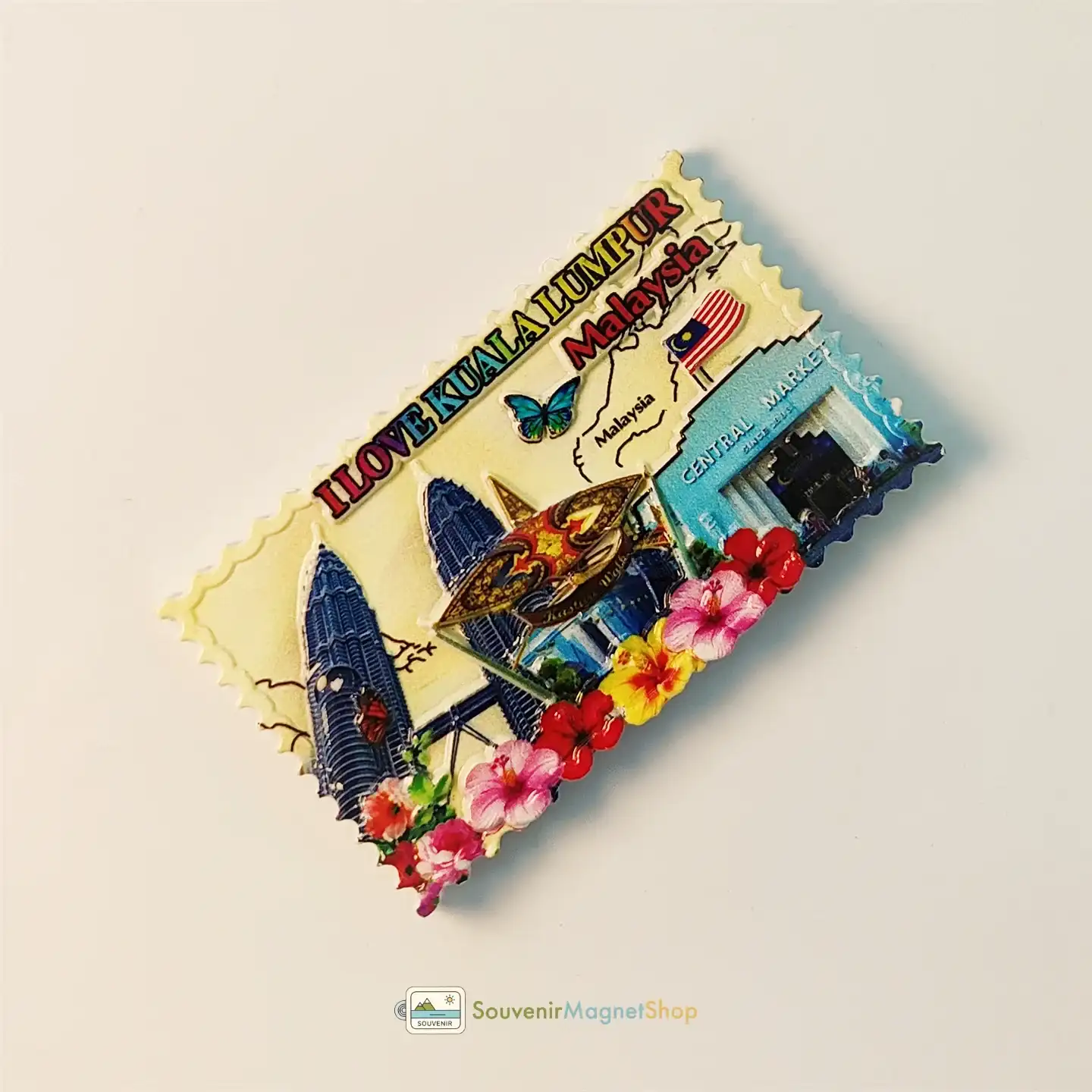 Capture Kuala Lumpur’s charm with this vibrant Malaysia fridge magnet. Featuring the iconic Petronas Towers and Central Market, it’s a perfect travel souvenir to remember your Malaysian adventure.