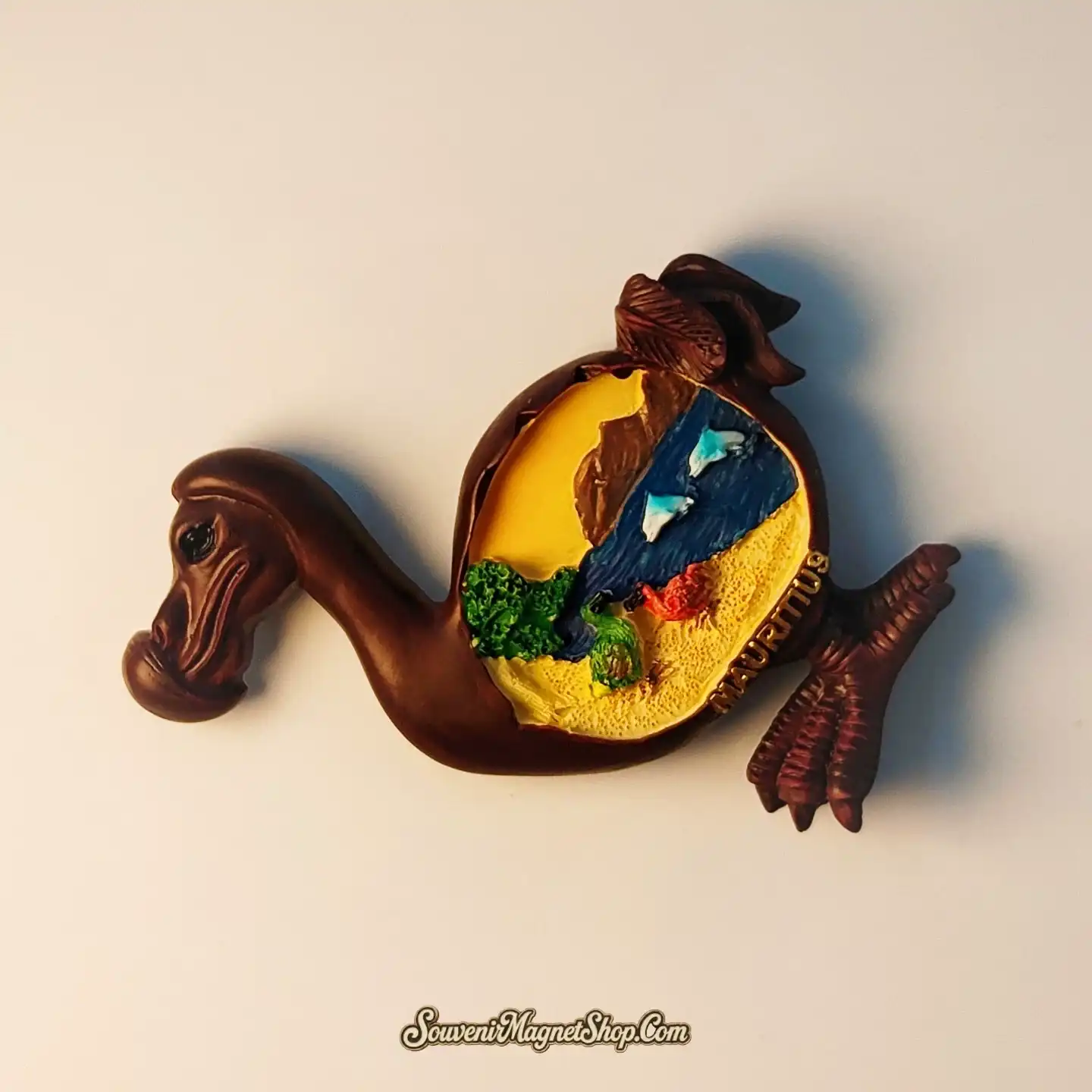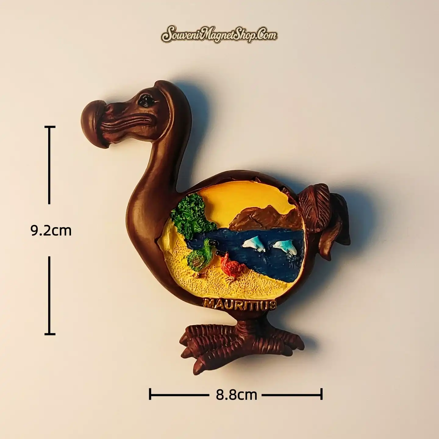 This meticulously crafted souvenir magnet beautifully embodies the essence of Mauritius. Shaped like the iconic Dodo bird, its body forms a captivating diorama showcasing a vibrant seascape with lively dolphins leaping through crystal-clear waters, a sandy beach, and lush greenery under a warm island sky.