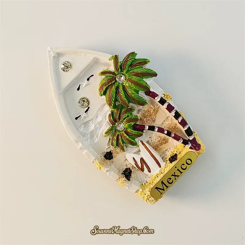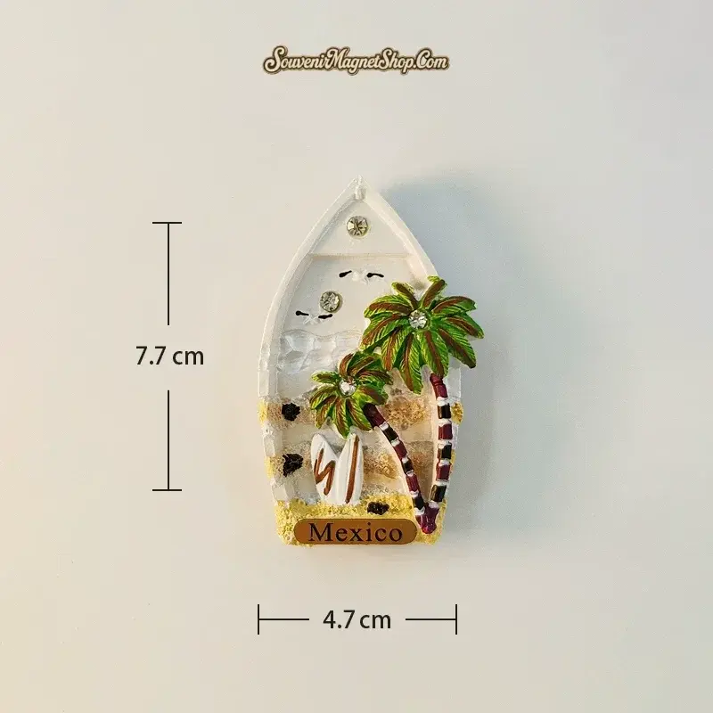 Shaped like a classic rowboat, this hand-painted 3D resin fridge magnet is a creative tribute to Cancun’s coastal lifestyle. Two lush coconut palm trees rise from the golden sandy beach, each crowned with a sparkling rhinestone gem. A white surfboard with a brown stripe leans casually against one of the palms — a nod to Cancun’s beloved surf and beach board culture.