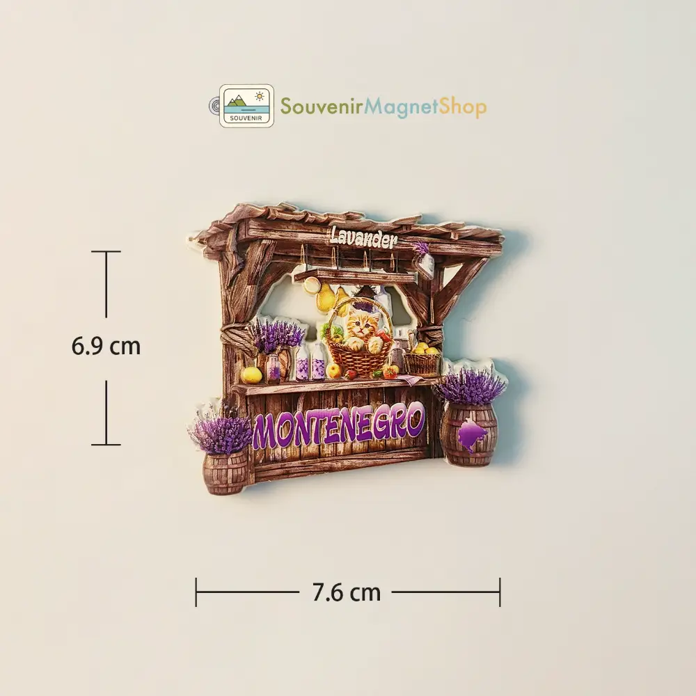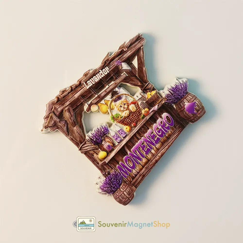 Adorable Montenegro fridge magnet featuring a charming lavender stall with a cute cat. Perfect souvenir to remember your trip or add a unique touch to your home!