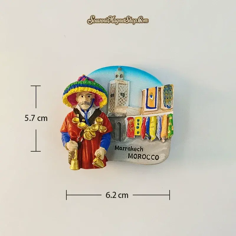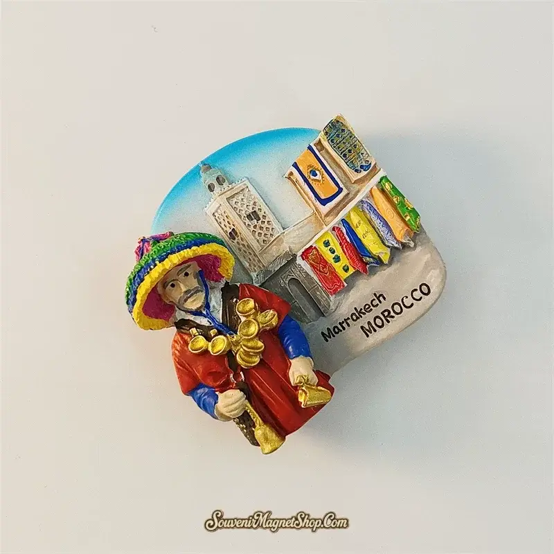 This Morocco Marrakech fridge magnet captures the spirit of the city’s famous street culture in rich 3D hand-painted detail. The central figure of the Guerrab is rendered in vivid color — a flowing red and blue djellaba, a towering multi-colored hat in green, yellow, pink and blue, and an elaborate arrangement of golden brass cups hanging from a decorated strap.